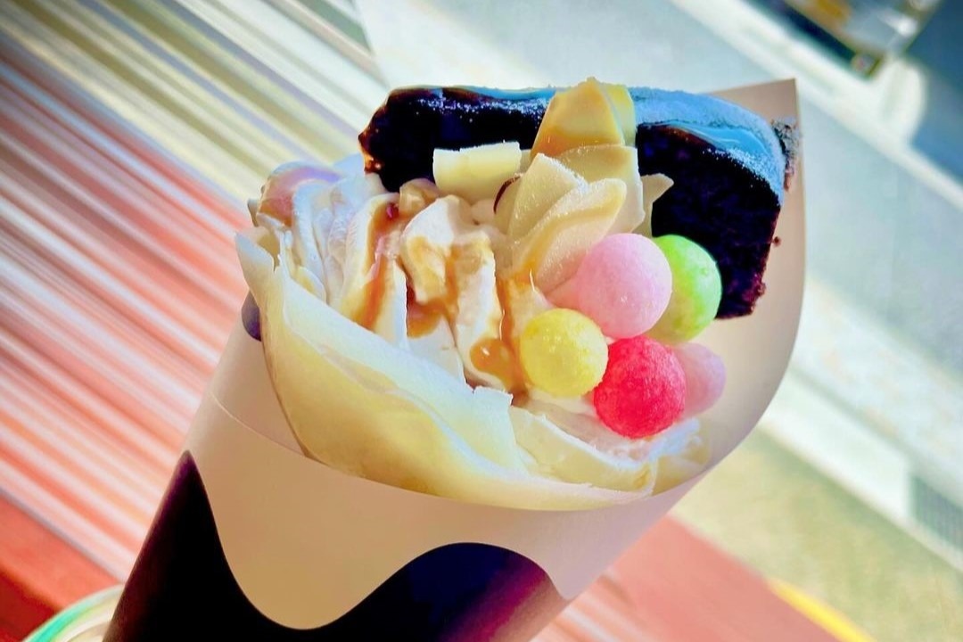 可愛いおだんごで人気の店「t2Lab.(ティーツーラボ)」の隣に2024年春にオープンした姉妹店「生クレープtabi」。オリジナルの粉をベースに、白バラ牛乳、生クリームを加えた白い生地のクレープが看板メニューのテイクアウト専門です。「バナナチョコホイップ」(680円)や「ミックスベリーホイップ」(630円)といった定番のほか、「備中大納言ホイップ」(680円)やおかず系など約20種類を提供しています。※価格の変動あり
