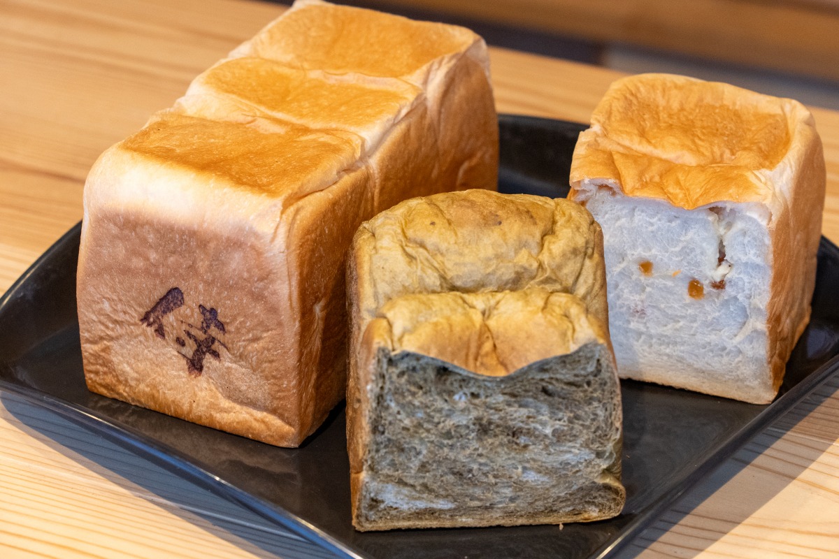矢掛宿の通りのほぼ中央にある高級食パン専門店。看板商品は「生食パン」(1本980円)。小麦粉、牛乳、バター、生クリームといった材料はすべて北海道産。小麦粉に熱湯を加えてこねる湯種製法により、もちもちの食感とふんわりとした口溶けを実現した食パンは、トーストせずにそのまま食べるのが一番です。また、季節のテーマに合わせた食材を加えた月替わり生食パン(ハーフ580円)もあり、ひと味違う一品が楽しめます。写真はキャラメルジャム&ホワイトチョコ入りの「キャラメルラテ」と、ほうじ茶&ホワイトチョコ入りの「ほうじ茶ラテ」。