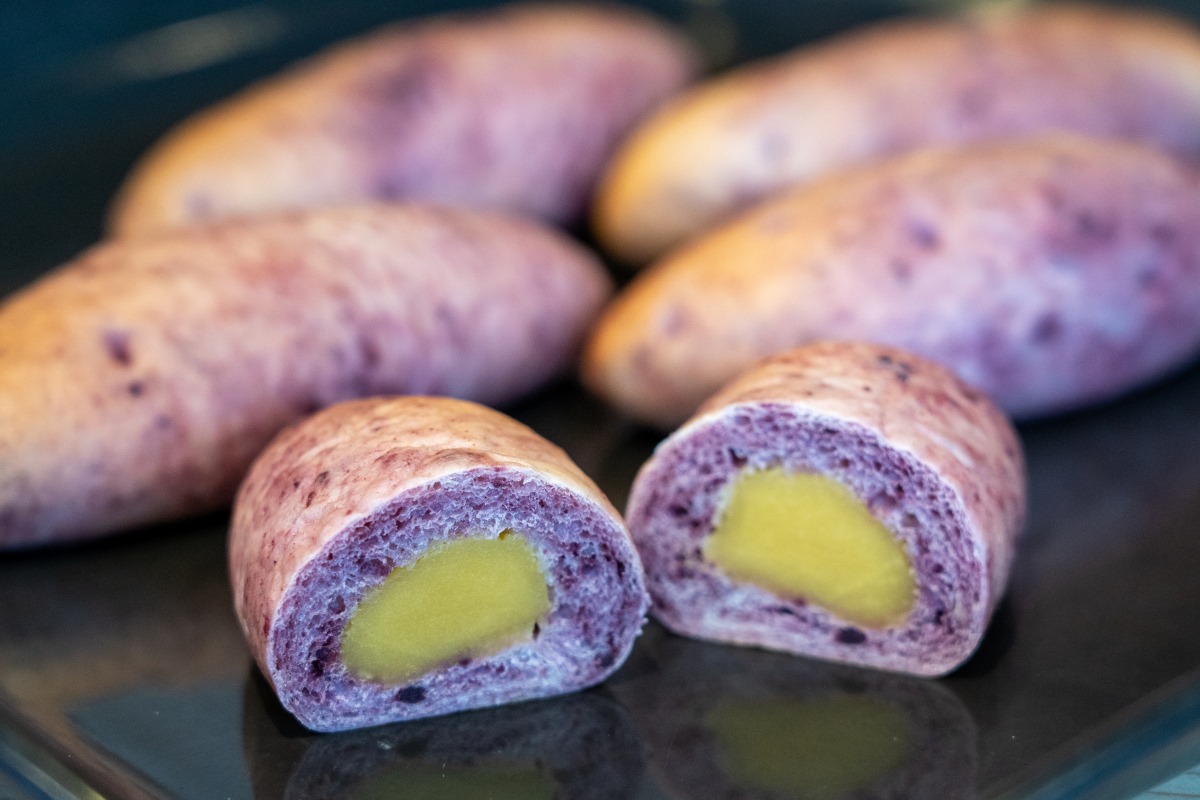 イベントにあわせた期間限定販売のパンも登場。こちらは『さつまいもフェス【芋旅】in YAKAGE』の特別メニュー「さつまいもパン」(1個300円)。紫芋パウダーを生地に練り込み、さつまいもあんを包んだ、見た目も本物そっくりのスイーツ系パンです。