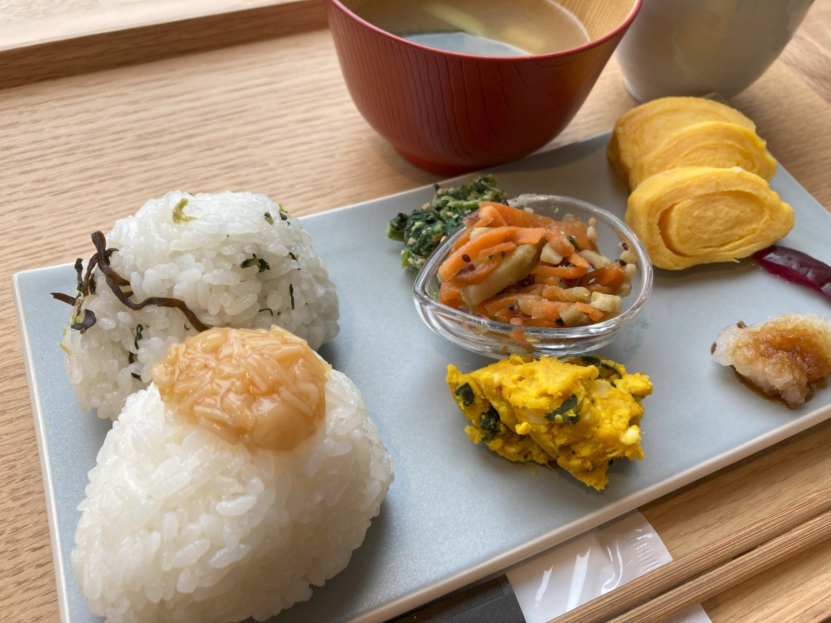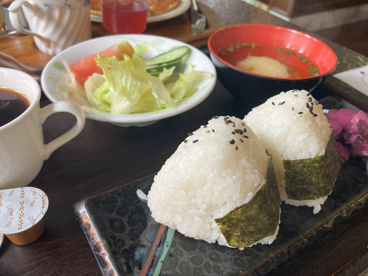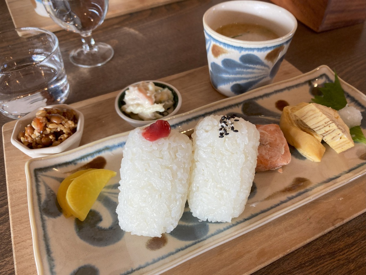倉敷市青江に位置する「roastery cafe 縮図」では、地元岡山県産のお米「ヒノヒカリ」で作る、ツヤツヤでもちもちのおにぎりが楽しめます。おにぎりモーニングには、2種類のおにぎりと月替わりの副菜3種、具だくさんで優しい甘みのお味噌汁がセットになっています。また、最近キッズモーニングも仲間入りし、ファミリーで楽しむのにもおすすめです。