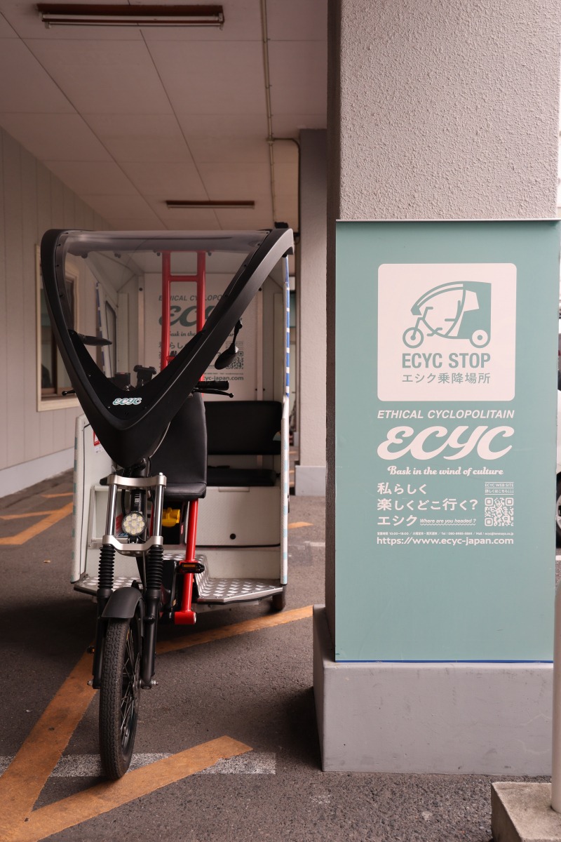 フランス製の「シクロポリタン」を使用した交通サービス「ECYC(エシク)」。環境に優しいという意味の「エシカル(Ethical)」と、この乗り物の名称「シクロポリタン(Cyclopolitain)」を組み合わせて「エシク」と名付けられました。どんな感じなのかわくわくしながらさっそく乗降場所へ。