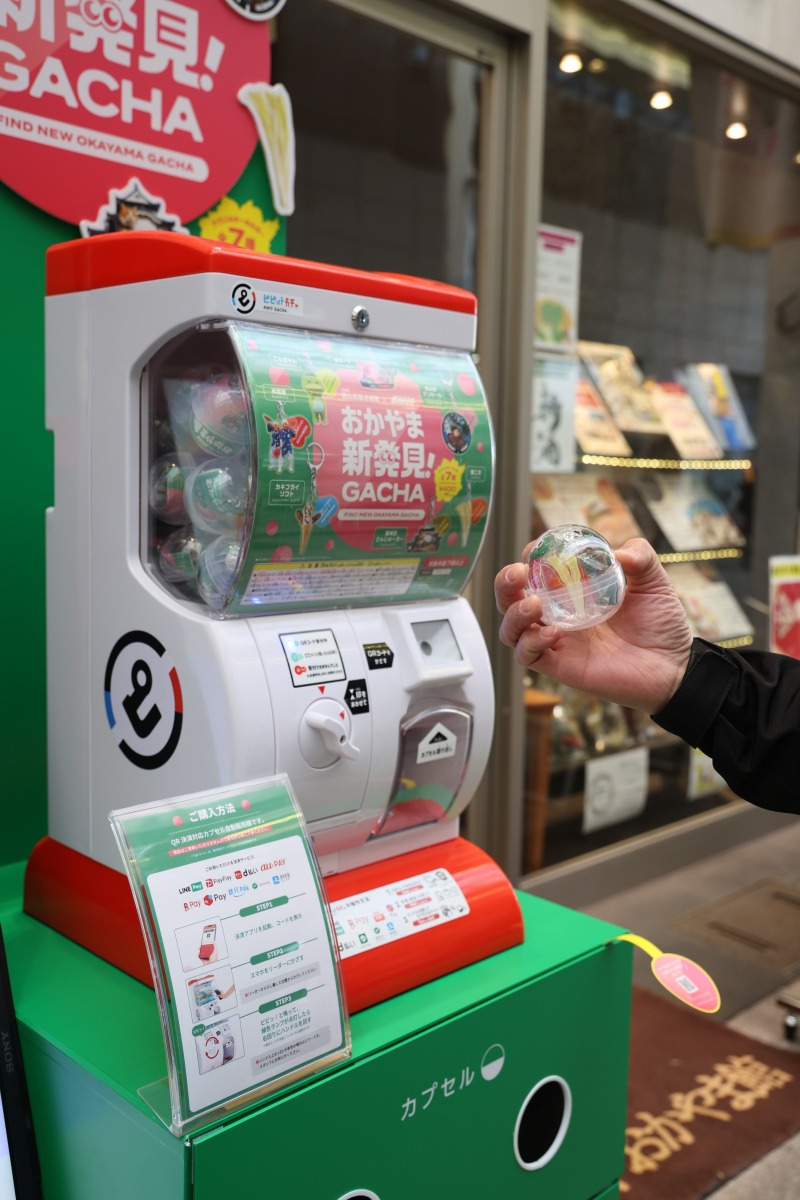 ドライバーに待機してもらってお店などに立ち寄れるサービスがあります。岡山城から駅方面へのちょうど帰り道、表町商店街の中にある「晴れの国おかやま館」を行き先にリクエストしました! 店頭には最近始まった「おかやま新発見!GACHA」のマシンがあり、桃太郎マンホールや桃ボートのデザインなど、岡山県内限定販売の全7種のアクリルキーホルダーが当たります。早速ドライバーの野村さんと一緒にガチャ体験!
