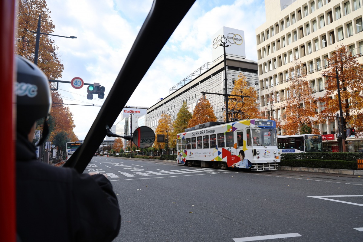 帰りは紅葉がきれいな桃太郎通りをまっすぐJR岡山駅に向かって走ります。車道を通るのですが車線が多く、路面電車やバスもたくさん走る大通り。すぐ隣をバスが走り抜けていくのでとてもスリリングでした。この日は遅れていた紅葉がちょうど見頃で、車道の真ん中から眺める景色は見たことのない光景で圧巻でした。