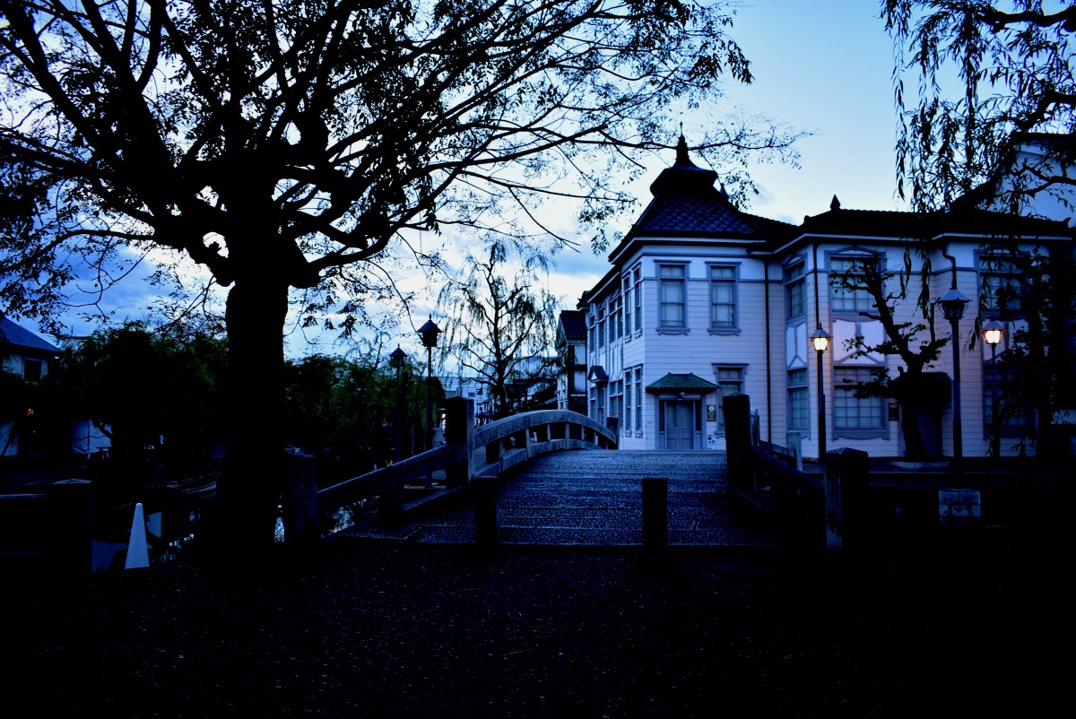 冬の朝6時台。まだ静寂につつまれている倉敷美観地区。中橋のたもとの観光案内所「倉敷館」が暗がりの中に浮きあがっています。「倉敷館」は大正6年に建てられた擬洋風建築で、国登録の有形文化財でもあります。銅板葺きの塔屋。白い板張り。いつもとはちがう早朝のまちの気配にハッとさせられますよ。※「くらしき川舟流し」のチケット購入はこちらです。