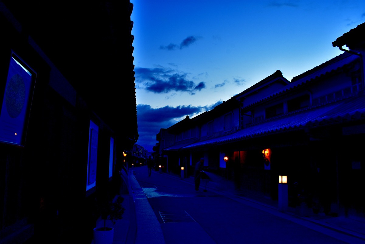 倉敷川沿いを貸し切り気分で少し歩いた後は、ひとつ奥の路地へ。古い町屋が軒をつらねる本町通りです。水をまく人。犬の散歩をする人。ジョギングする人。鶴形山の南麓の旧街道のくらがりの中では、商いの町の営みがもう始まっていました。