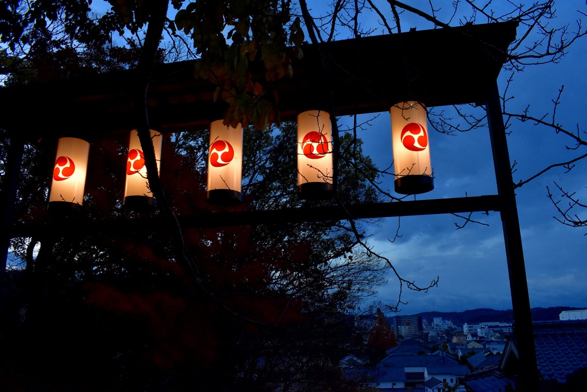 幻想的な提灯のあかりに導かれるように、神社の東参道をのぼっていきます。倉敷美観地区から最短で境内へ行けるルート。階段はすこし急ですが、右側には坂もあって坂道ダッシュをする学生さんたちの姿も見られました。パワフルな朝活に背中をおされながら、一段一段。いざ「阿智神社」へ。
