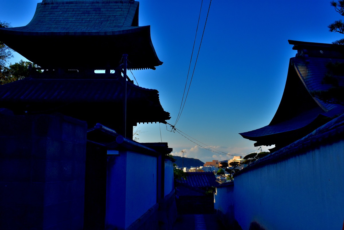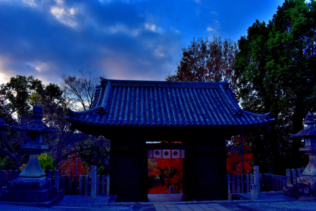 石段をのぼり随身門をくぐると、倉敷の総鎮守「阿智神社」の拝殿前へ到着です。12月初旬でもまだ色づいていたもみじを撮影する人々。朝一番の参拝をすませた団体さん。みんなそれぞれの場所で、静かに、日の出前のマジックアワーの空を見あげていました。