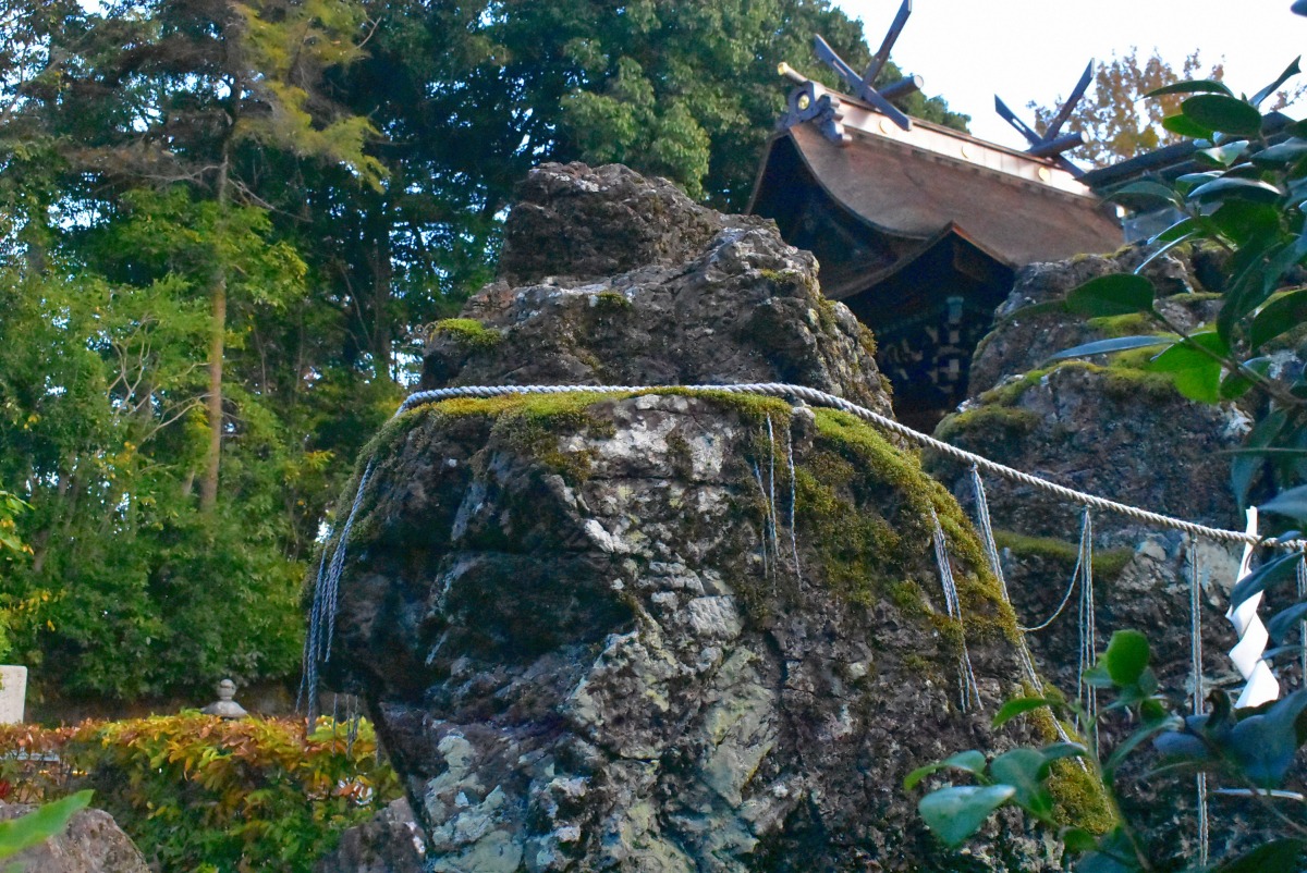 苔むした盤座(鶴石・亀石)のむこうに見えるのが、檜皮の葺き替えが完了したばかりの「阿智神社」の本殿です。30年ぶりの美しい姿の社殿は必見ですよ。本殿周辺は引き続き、2027年まで修築事業が行われるんだとか。