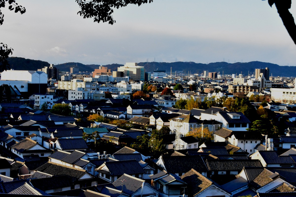 ちょうど鶴形山トンネルの上あたりからは、白壁の路地が見えますよ。路地の左側には趣ある鐘楼。路地の右側には、大イチョウの美しい観龍寺。路地をぬけた先、倉敷公民館、有隣荘、大原美術館までが一望できる絶景スポットです。