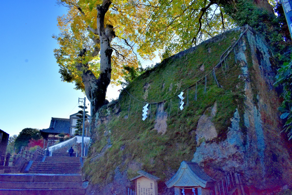 古い家々や、新しいマンション群。えびす通り商店街のアーケードの屋根を見下ろしながら、鶴形山をどんどんくだっていきます。大きな大きな盤座のかたわらを通り過ぎたら、西参道の入り口の鳥居です。ほんとうに山まるごと神域なんですね。