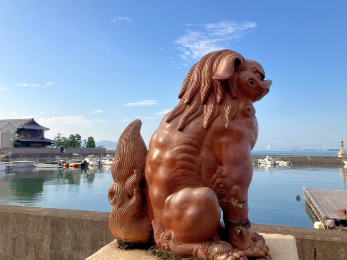 瀬戸内海をのぞむ最高のロケーションには、岡山ならではの備前宮獅子がよく似合ます。鍛え上げられた(!?)腹筋背筋。晴れの国の日差しをたっぷり浴びて、小麦色ならぬ褐色に焼けた肌。この海を、由加の山を、護るぞ!という気概すら感じさせる、ライフセーバーのような狛犬さんです。