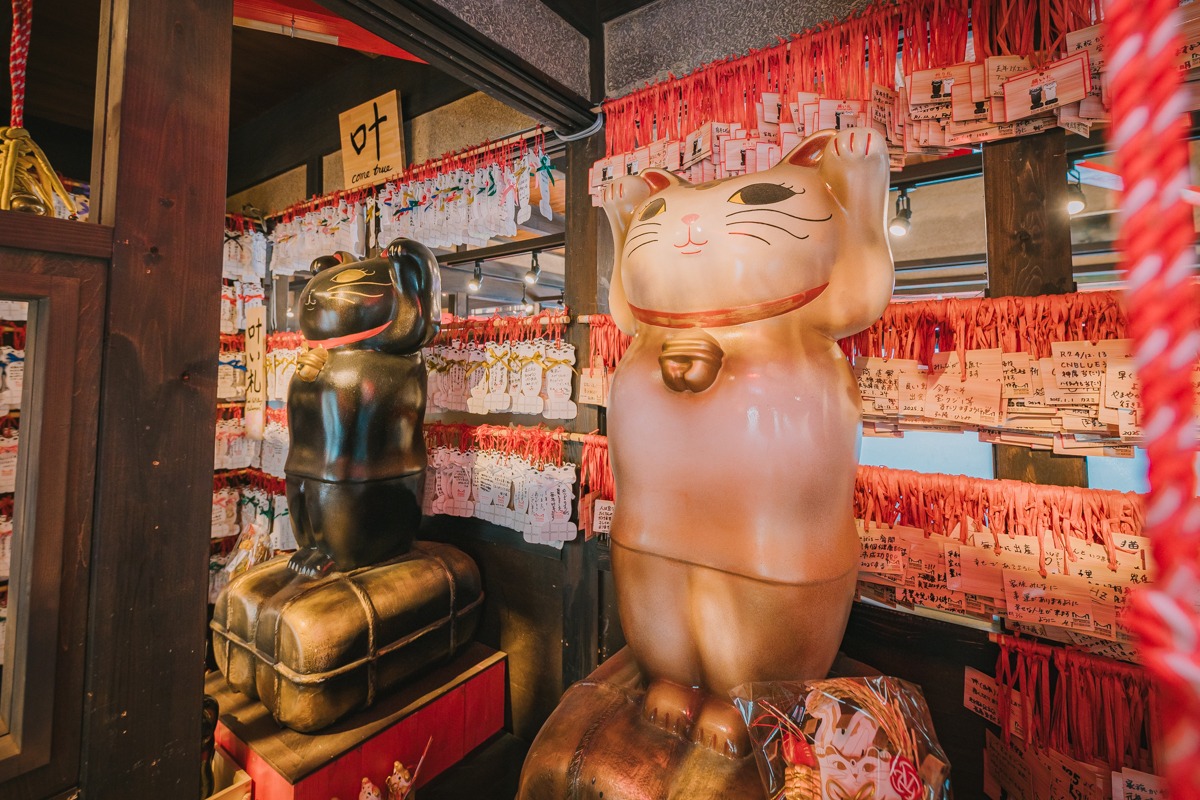 階段前にある黄色い顔出しパネル「顔出しにゃんこ」は、3ヶ月前に登場したばかりの新名所! 記念撮影にぴったり!さらに、赤い「吉兆門」をくぐれば、何か良いことが起こるかも…!? そして、門の上をよく見ると、まるで猫ちゃんが散歩しているようなオブジェがあるので、お見逃しなく。