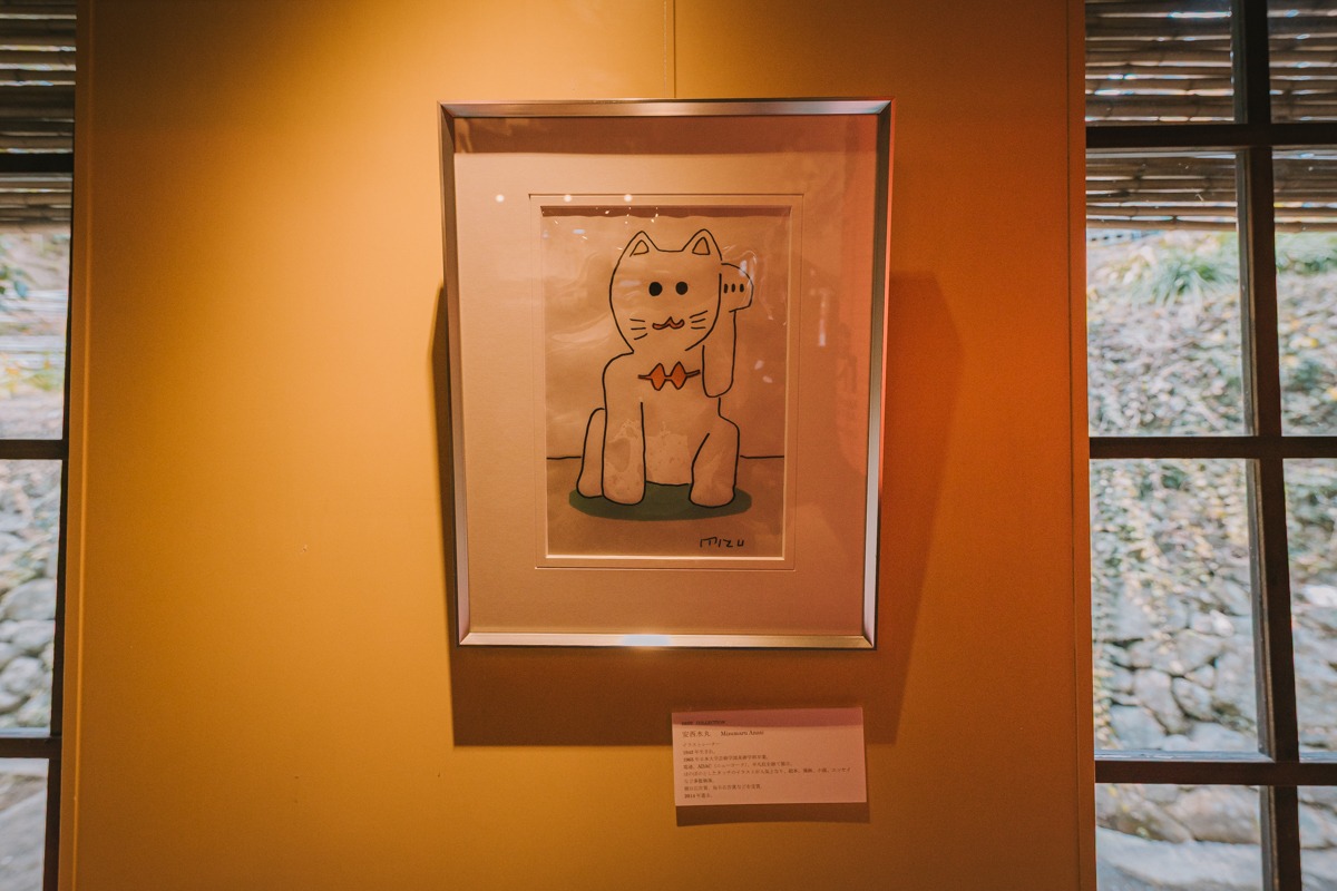 招き猫美術館では、歴史的な伝統的な招き猫だけでなく、有名アーティストの作品も多数展示されています。こちらは安西水丸さんの作品。安西水丸さんは、村上春樹さんの短編小説やエッセイの表紙などでお馴染みの方も多いと思います。また、絵本「がたんごとん」の作者でもあります。
