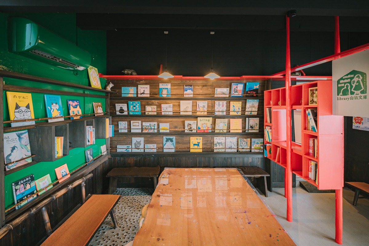 絵付け体験スペースのお隣の部屋「library山猫文庫」では猫の絵本がたくさん展示してあり、お手にとって読むこともできます。招き猫の絵付け体験で「どんな絵付けをしよう」と悩んだときの参考にもなりますよ。