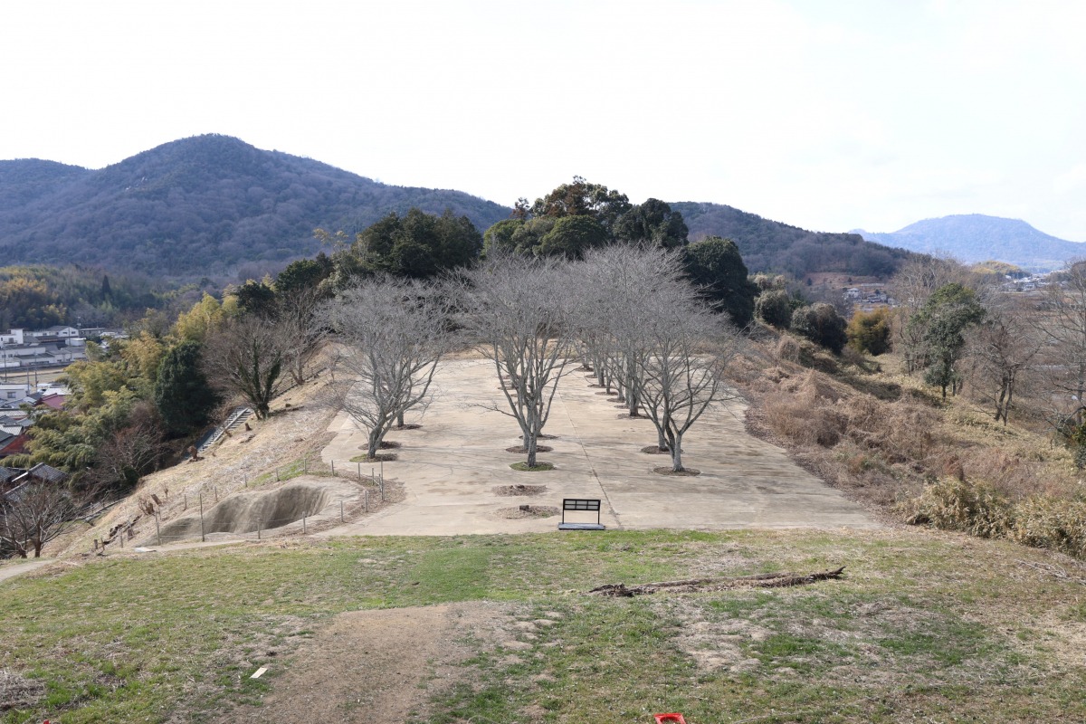 造山古墳後円部からの眺めです。ここからの眺めは古墳が前方後円墳であることを感じられ、また春になればピンクの桜がきれいだと思います。当時、この地に大きな勢力を持つ有力者がいて、大和朝廷と並ぶ勢力であったのではないかと、古墳の上から思いをはせてみるのもいいかもしれません。