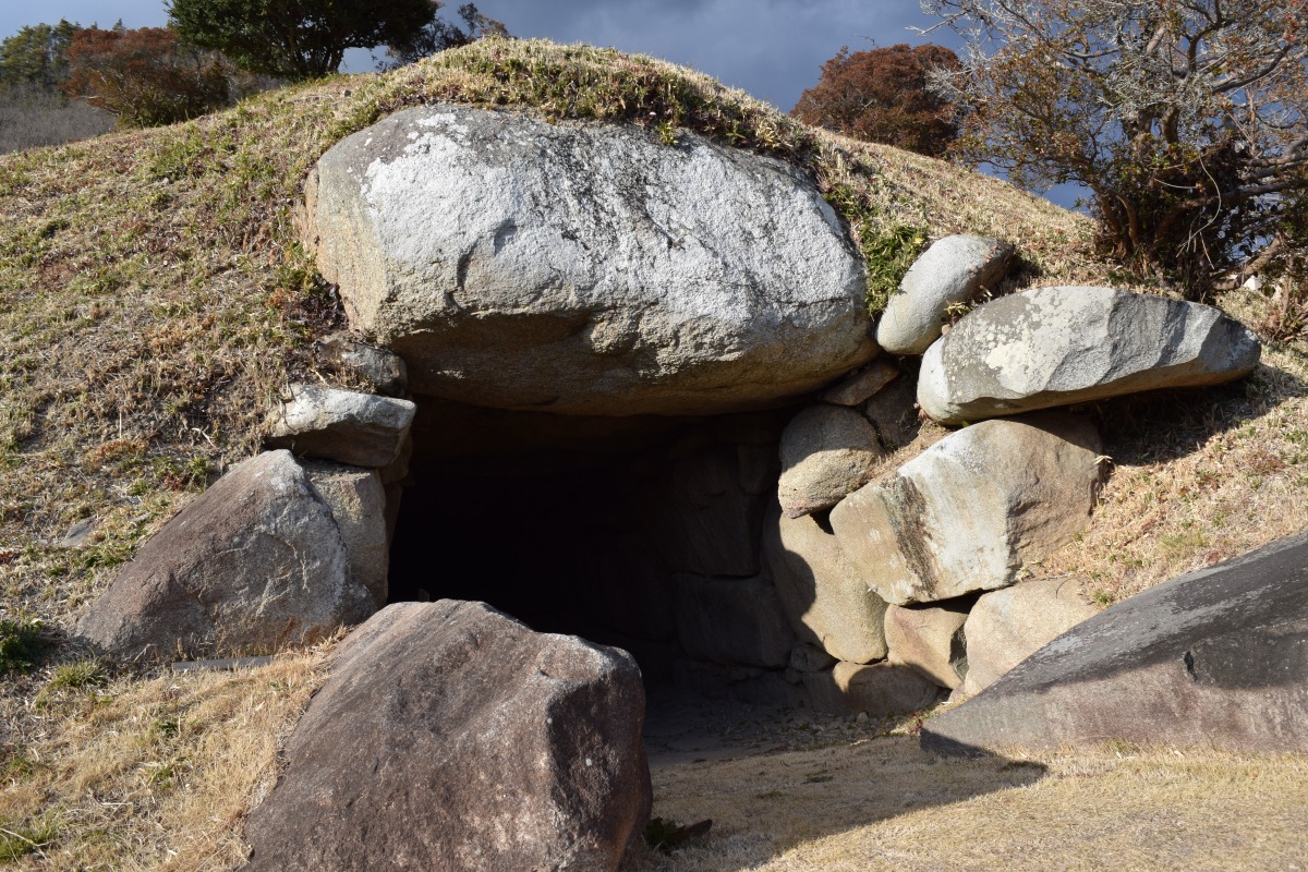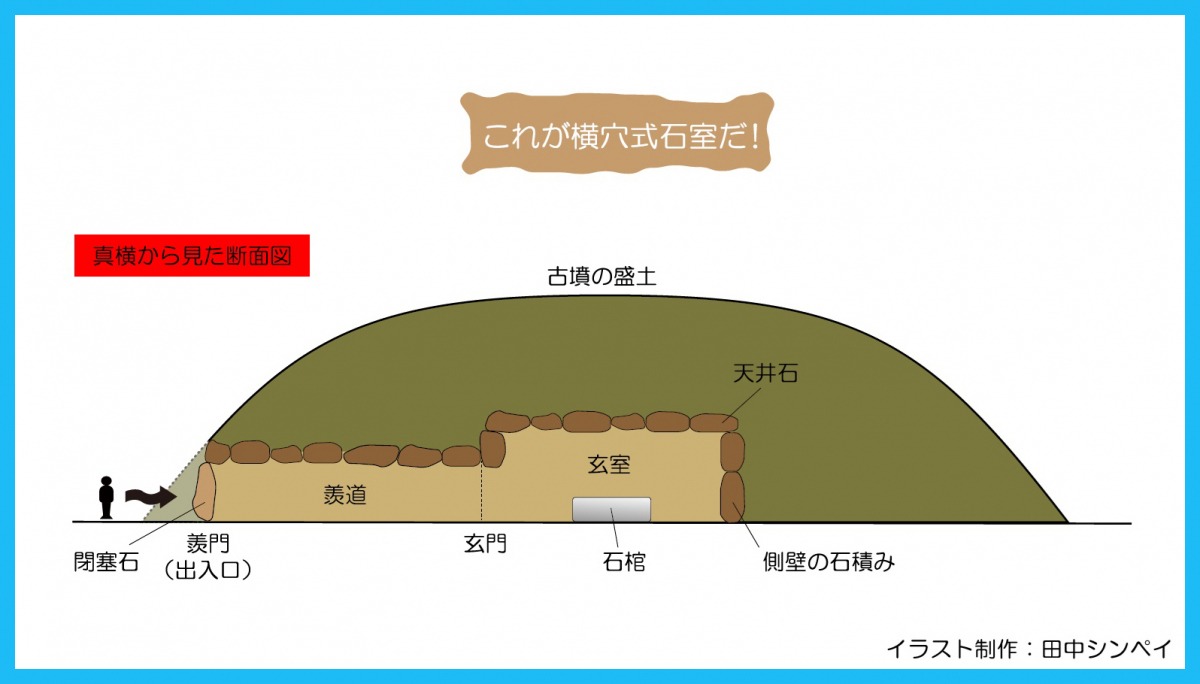 棺を納めるための地下空間「玄室」を設けて、そこへ真横から通じるトンネル「羨道(せんどう)」をつなげることで、何度も出入りできる構造にしたものです。例えば、被葬者が亡くなってからしばらく後にその配偶者が亡くなった場合などに、追葬できるようにしたのです。出入口(羨門)は閉塞石でふさいでおいて必要が生じたときには撤去し、追加で棺を運び入れていたと考えられます。
