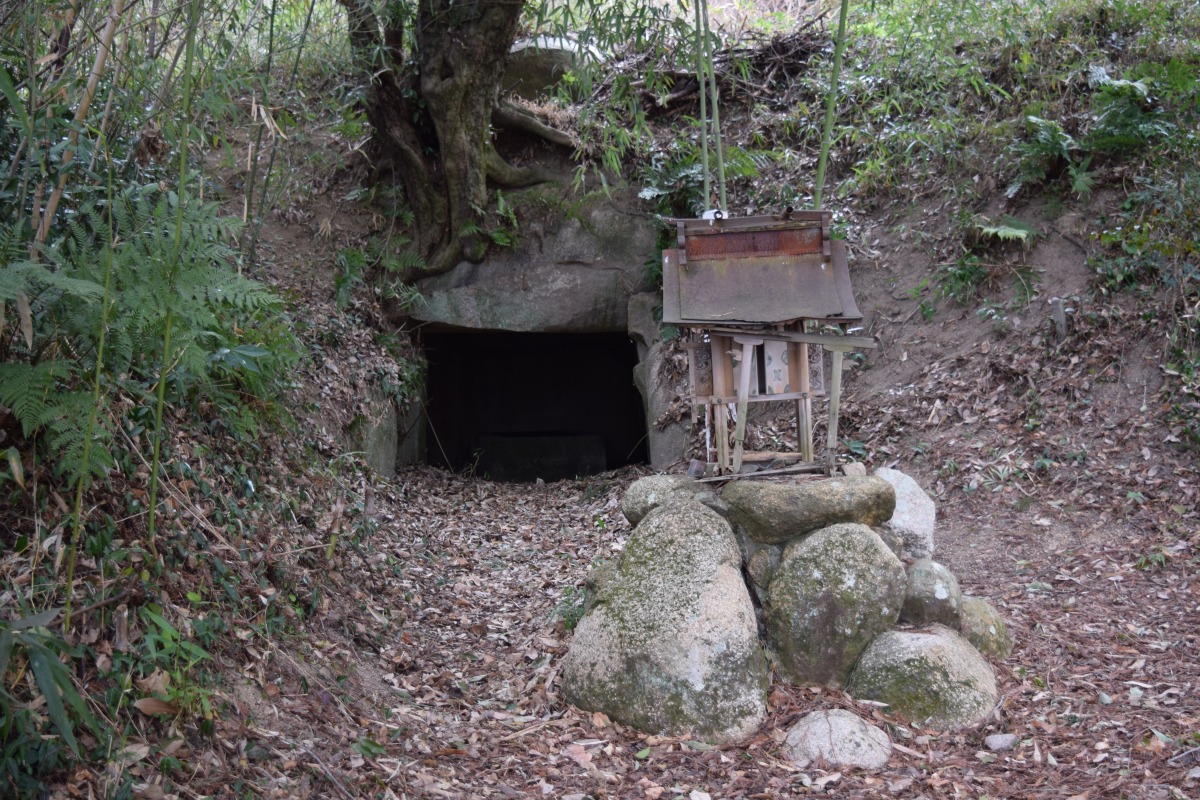 場所は岡山市中区賞田、龍ノ口山のふもとにあります。古墳の前には古い祠が建っていて、独特の空気を醸しています。石に張り付いた木の根も何かすごい…