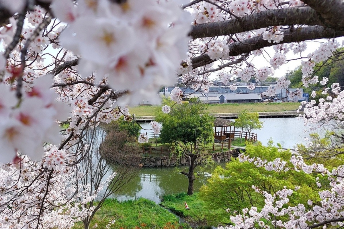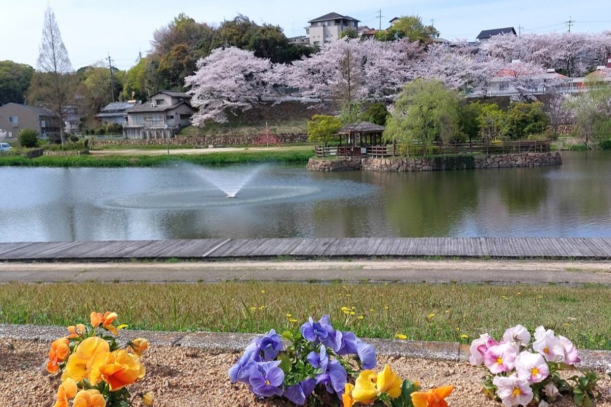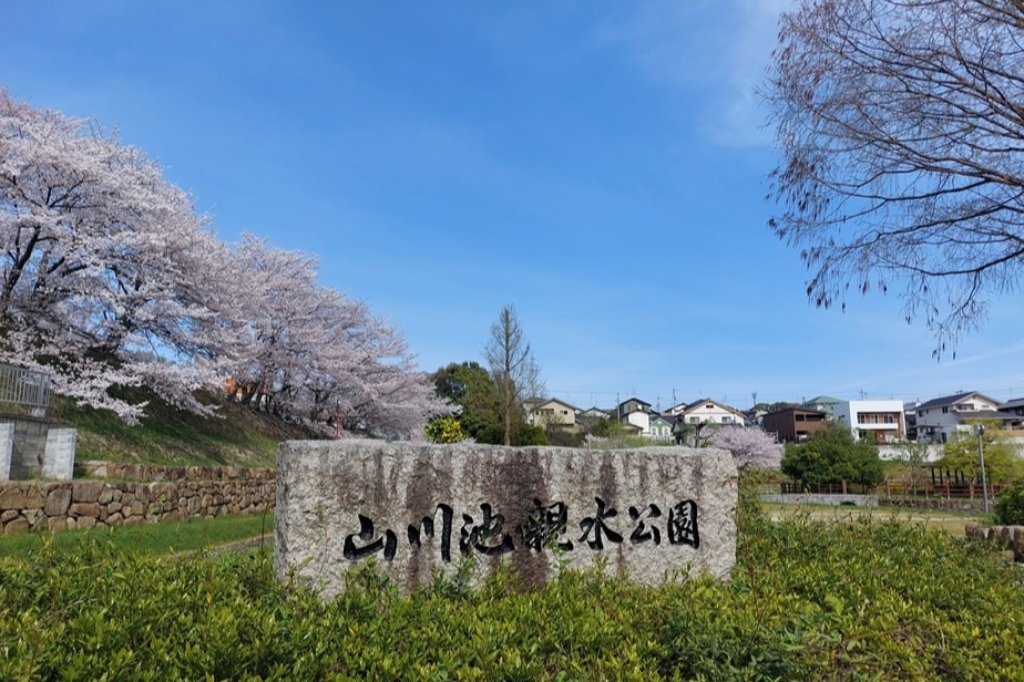 国道2号線からすぐ。桜や花菖蒲をはじめとした季節の花々が楽しめる「山川池親水公園」は、池に浮かぶように見える東屋や噴水がある水辺に親しむことができる公園です。