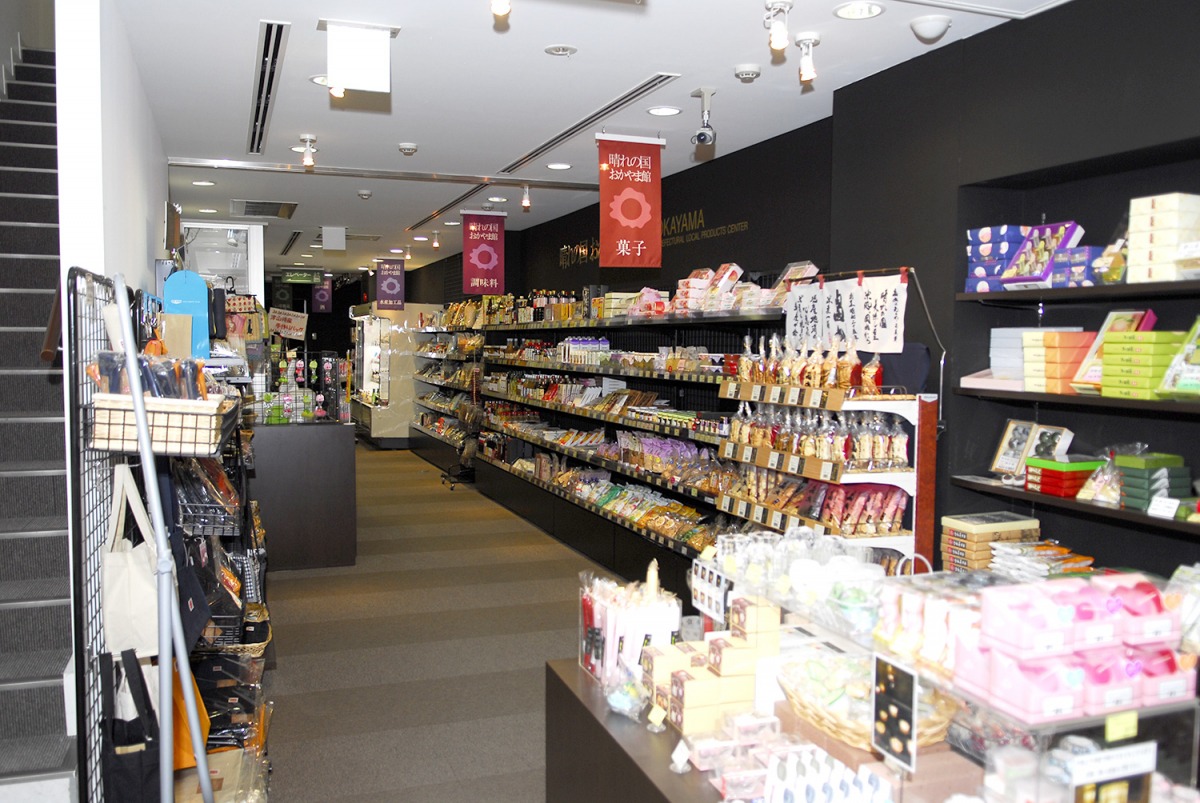 備前焼、民工芸品、銘菓や加工食品、酒、調味料など、岡山県内の特産品が多彩に揃っています。観光スポットである岡山城や後楽園からも徒歩約10分という便利な立地です。