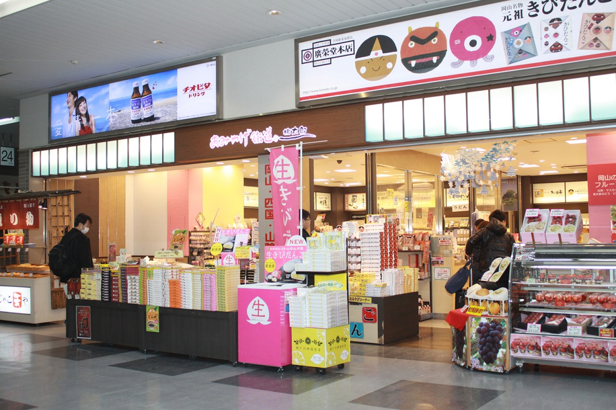 岡山駅構内にあり、JRで移動する際には最も便利なみやげ物屋です。岡山土産の定番「きびだんご」も種類豊富な品揃え。その他の地元銘菓や地域限定商品、キャラクター商品などにも出会えます。
