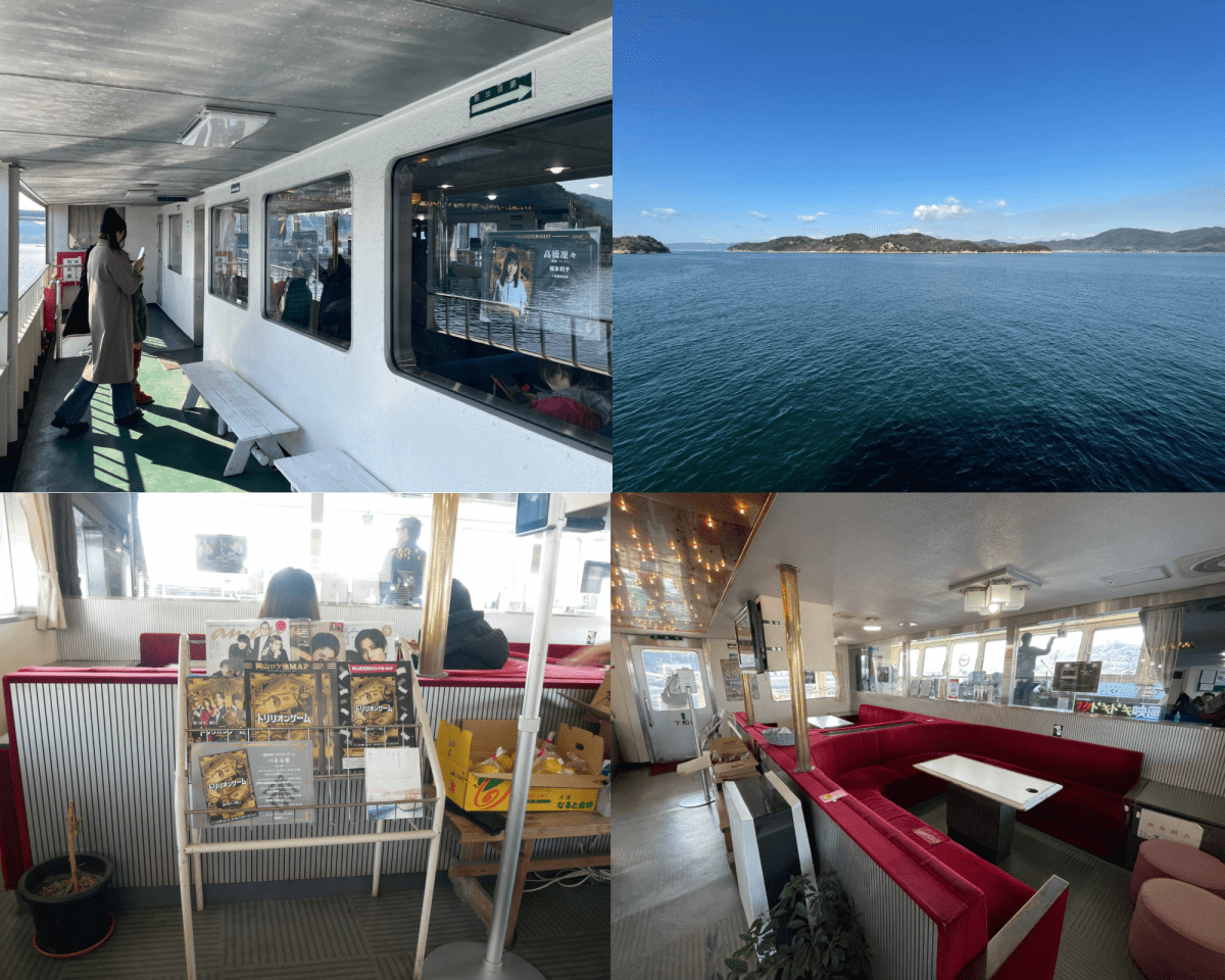 9時25分に笠岡(伏越)港を出港するフェリー・金風呂丸に乗り、白石島に向かう約40分の船旅です。撮影で使われた金風呂丸は、定員93名、車両も搭載できます。映画で見たままですね!キャストや撮影スタッフも毎日笠岡港から船に乗って島に渡っていたそうです。