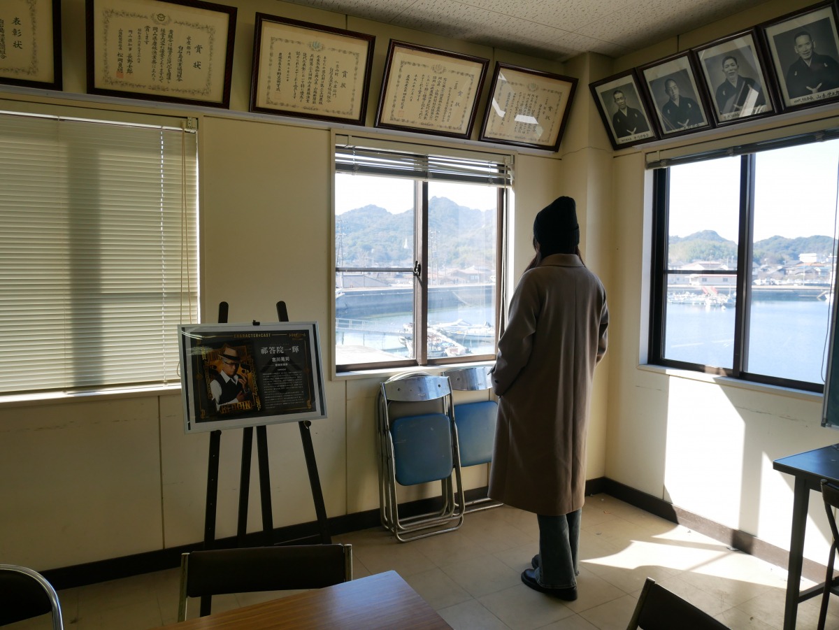 桃木島の村長室の設定で登場した「笠岡漁業協同組合白石島支所」の会議室。パネル展の開催期間だったため建物内に入ることができました。「劇場版『トリリオンゲーム』パネル展」は、3月8日(土)~3月13日(木)まで真鍋島の「五里五里」と、3月15日(土)~3月21日(金)まで「真鍋中学校」でも開催されます。