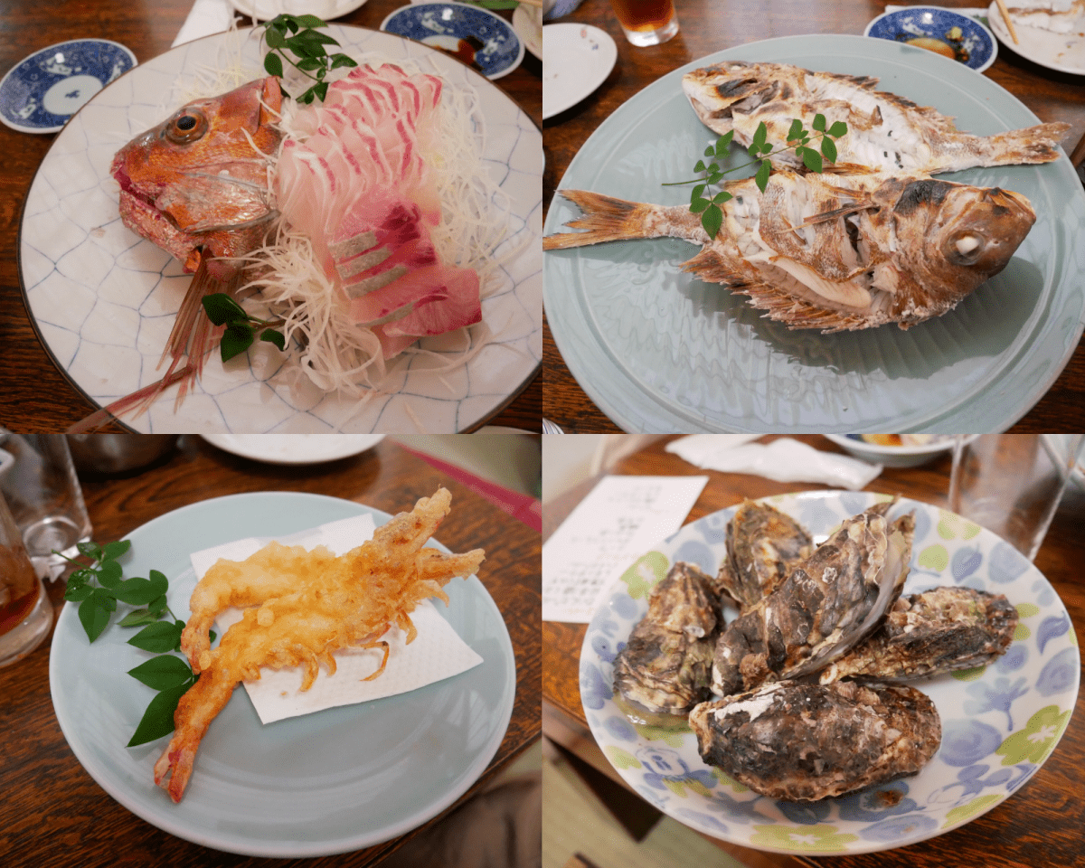 刺身、生かき、蒸しかき、鯛の蒸し焼き、天ぷら、煮つけ、南蛮漬け、あら汁など、10品以上の料理が次々と運ばれてきました!どれも新鮮でぷりっぷり。姪っ子は鯛の美味しさに感動していました。