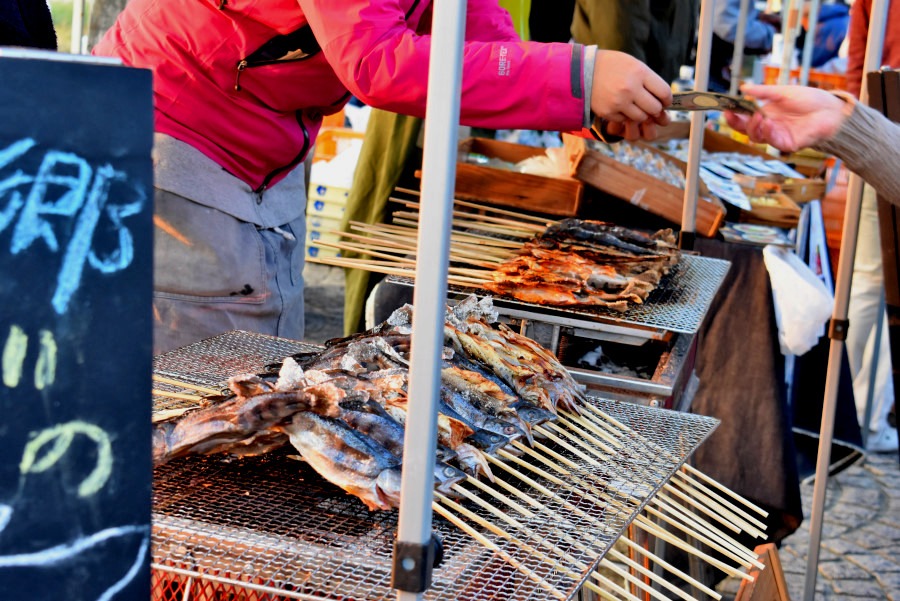 軽トラの魚屋さんが旬を運んできます。鮮度の良さは一目瞭然、朝採れママカリの美しいこと。フリマでは骨董やアンティークの掘り出し物も見つかりそうです。