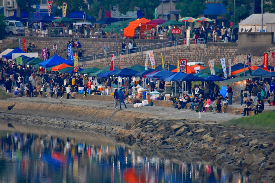 これぞ岡山の大食卓。つくる人と食べる人の熱量にしり込みしてはいられません。月と太陽をつづけて両方拝める朝5時の京橋。スッキリした気持ちで1日がはじまります。