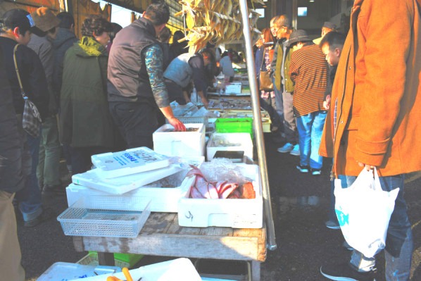 港直結、漁協直営、自信の〈活き〉です。お客さんも目利きに真剣。大型観光バスもやってきて、殻付きカキがごろんごろん山積みの中、上野アメ横ばりの人混みです。