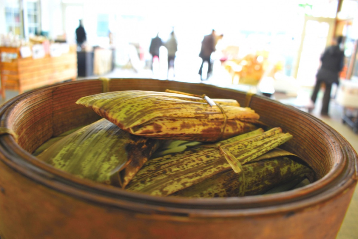 [有漢もり川]さん初代命名『ちょぼ蒸し』。竹皮に包まれたおこわです。せいろ越しに、ガハハと笑う三代目の心意気とうけつがれた旨味がギュウっとつまってます。もっちもちです。