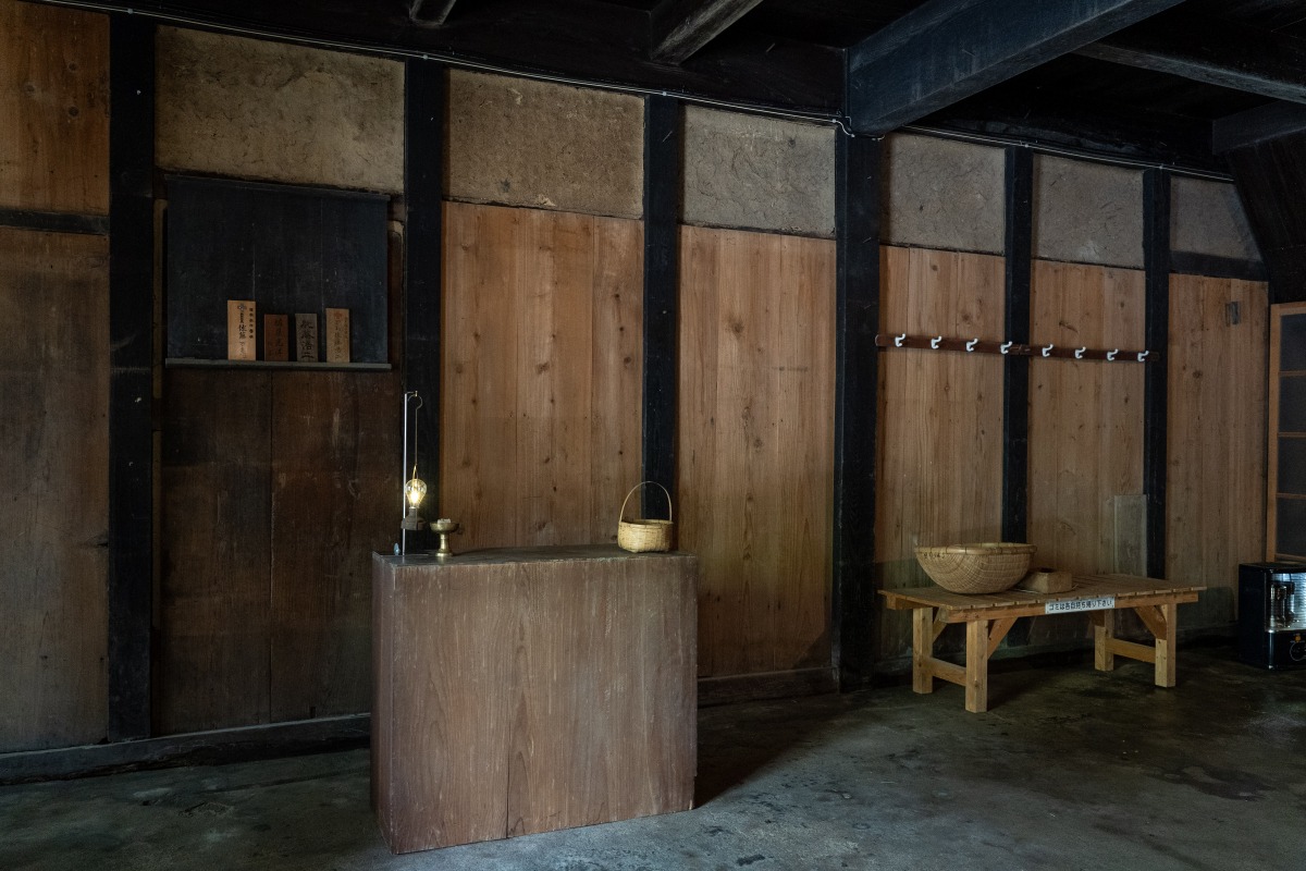 入口をくぐるとひんやりと心地いい土間。ここがチェックインを行う宿のレセプションになります。もともとあった家具などを再利用したカウンターは、シンプルで飾らない佇まい。