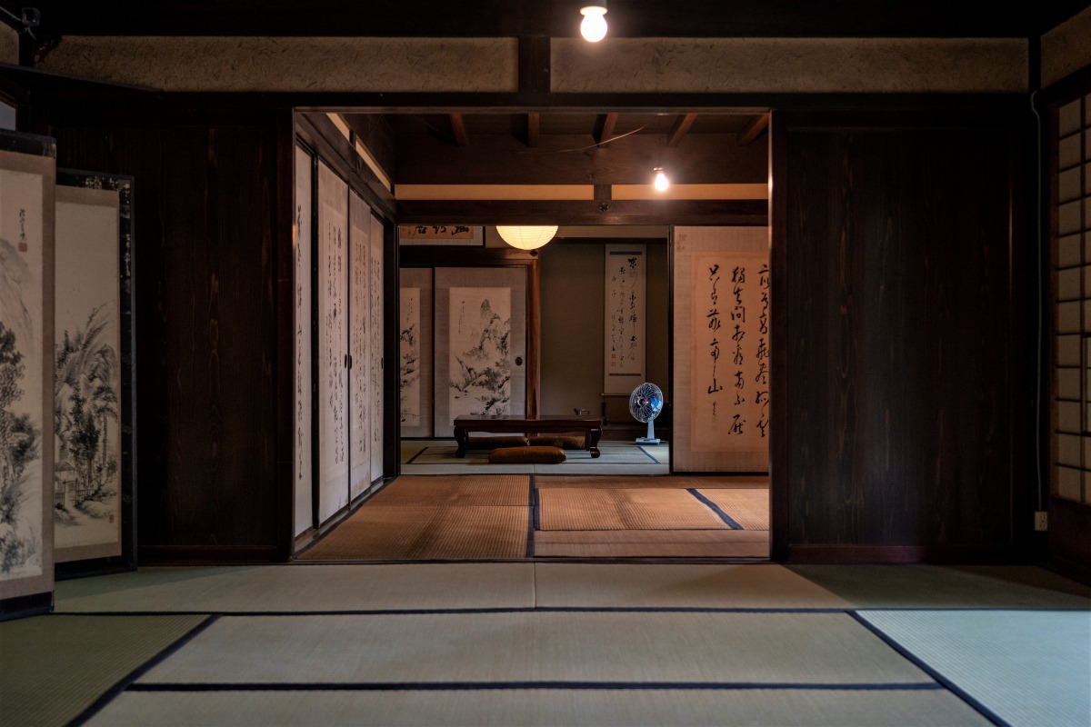 土間から見た宿の内部。一番手前は共用スペースとして、今後ワークショップなどのイベントの実施も考えているそう。その先は本来の表玄関を上がったところにある間、一番奥が客室です。「本陣 佐藤邸」は畳の間が並ぶ書院造りで、違い棚や天袋、平書院のある床なども備えられています。