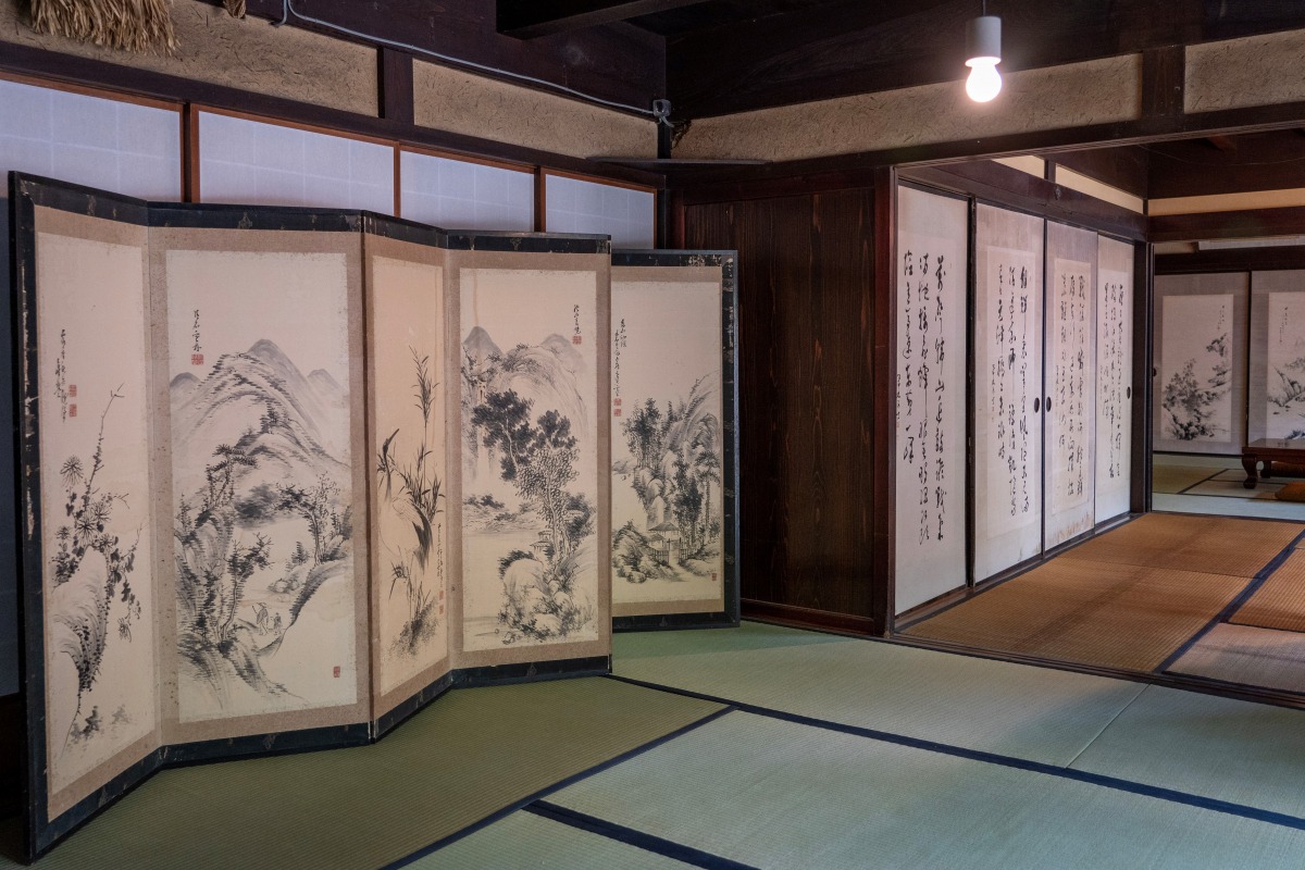 佐藤邸には書画がたくさん残されていたとのことで、書や山水画の描かれた屏風や襖など、和の趣を感じる作品が随所に見られます。