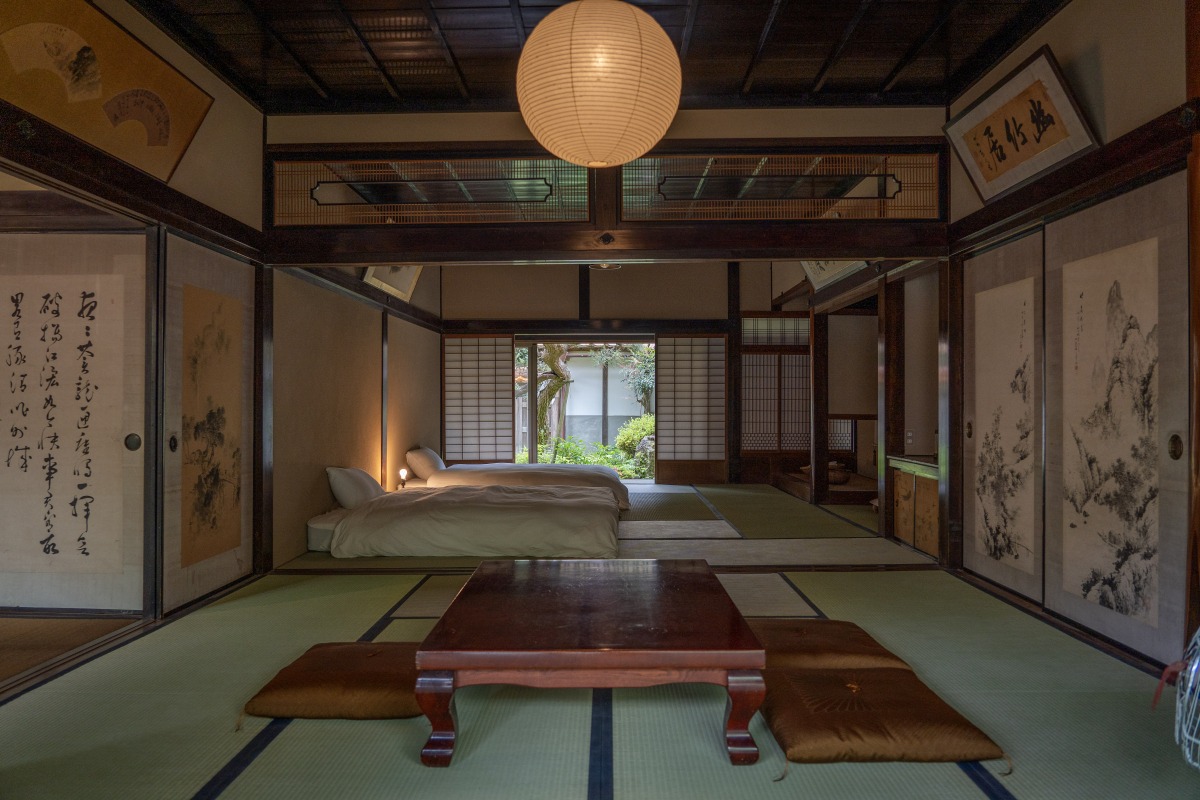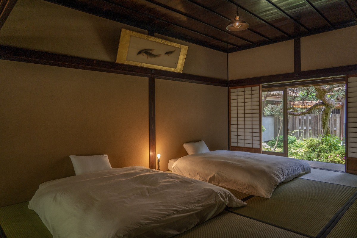 中庭に面した座敷は寝室として利用され、到着時から布団が敷かれています。清潔感溢れる寝具は寝心地よさそう。