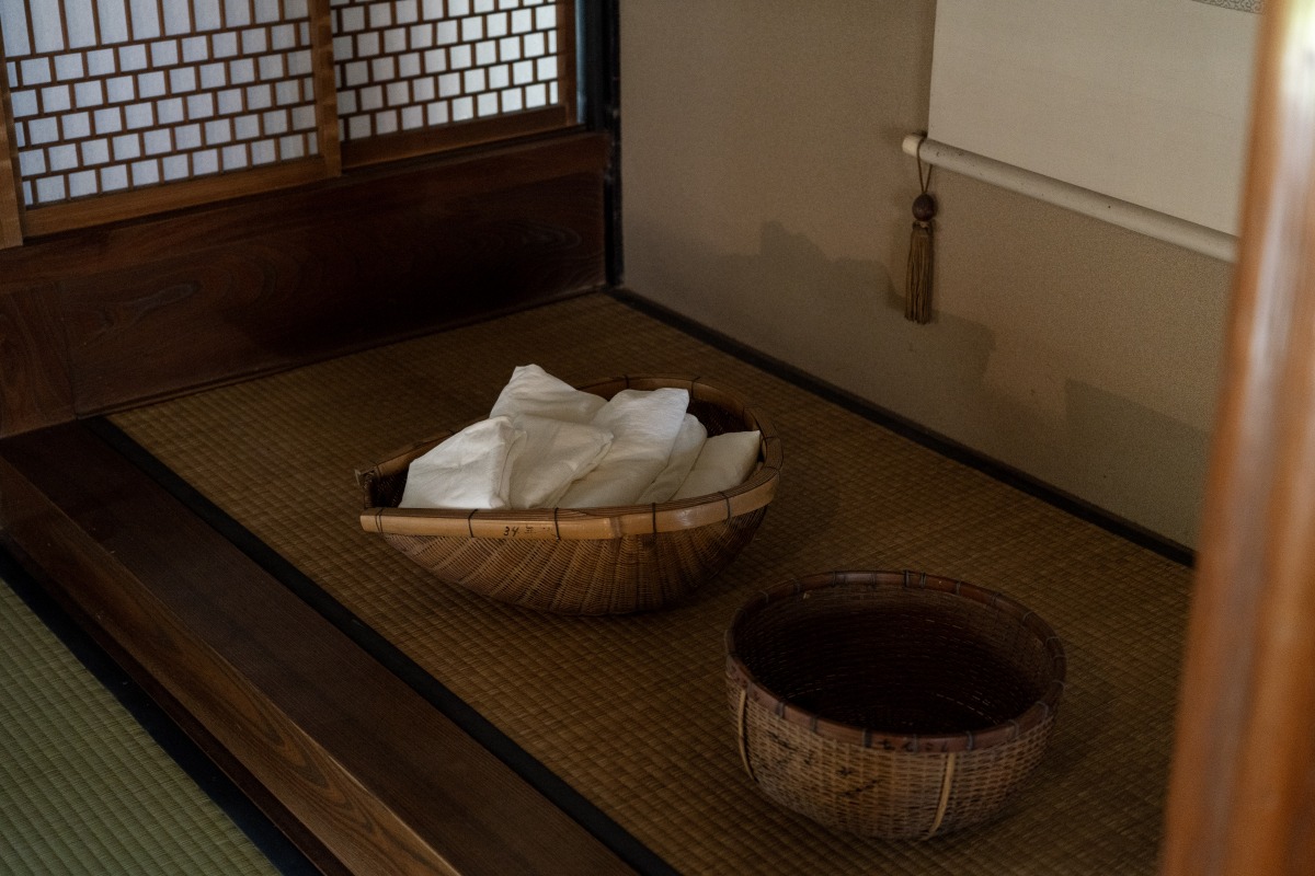 ざるや籠はアメニティ入れに変身。ちょっとしたアイデアで古いものも素敵に活かされていました。
