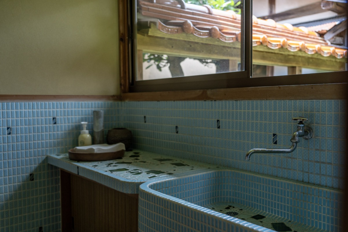 洗面所はレトロなタイル張り。10年ほど前までは人が住んでいた建物なので、水周りなどの基本的な設備は整っています。