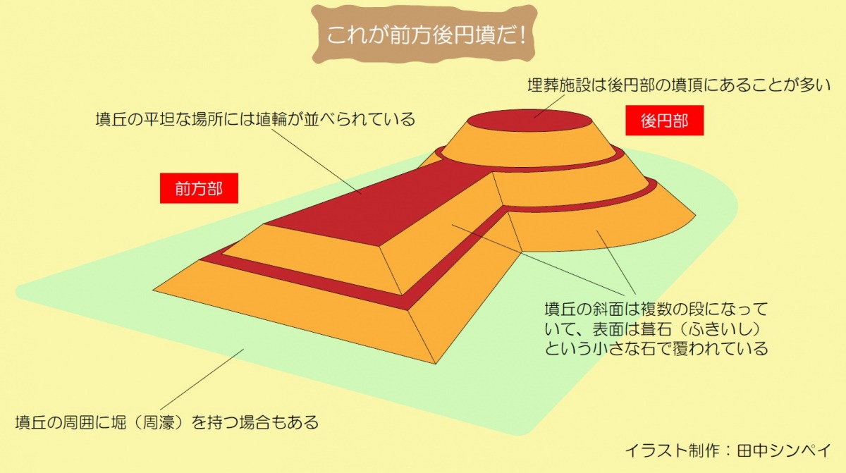 その成り立ちには諸説ありますが、基本的には円形の部分がお墓の本体で、そこへ儀式などを行なう祭壇として方形の部分を組み合わせたと考えられています。便宜上“前方”や“後円”と呼んでいますが、実際には古墳の向きに前や後ろがあるわけではありません。