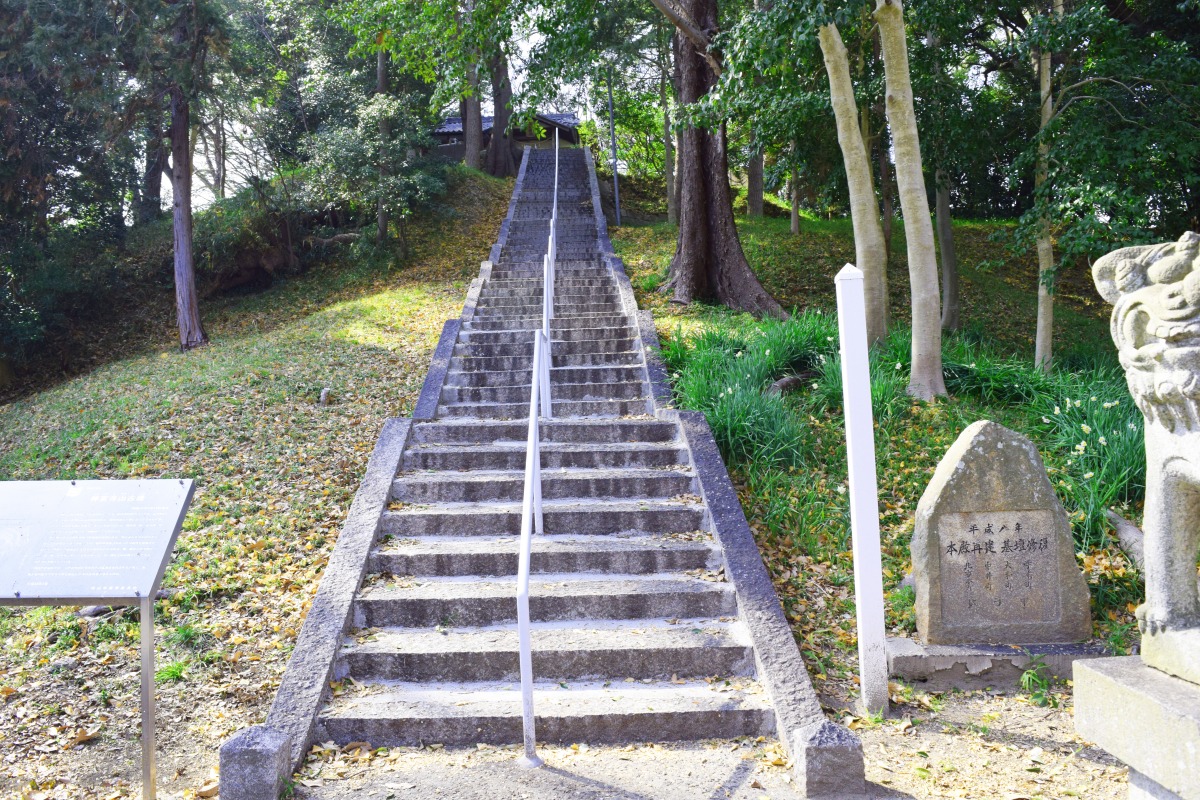 神社の階段を登る前に、ふもとから「後円部」を見上げてみます。何も知らなければ普通の山にしか見えず、思わず“ふもと”と言ってしまうくらいの大きさがあります。しかしよく見ると後円部が3段になっていて、人工の構造物であることがはっきりと視認できます。