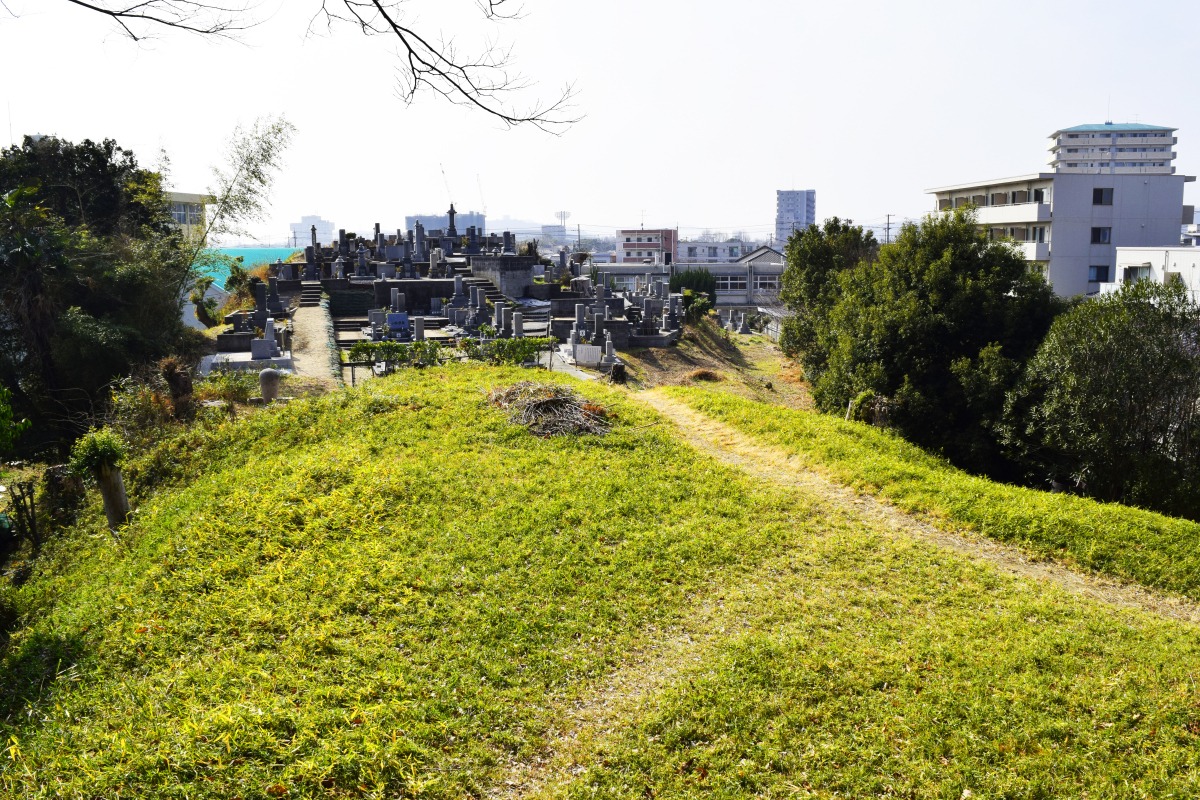 それでも、墓地の右下のほうを注意して見ると前方部がしっかりと2段になっていることが確認でき、古墳としての威厳をギリギリのところで保っている感じがします。