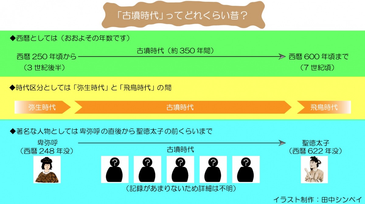 前方後円墳が日本各地でさかんにつくられた時代(3世紀後半~7世紀頃)を「古墳時代」と呼びます。前方後円墳は権力者にとって重要なステータスで、古墳時代中期(5世紀頃)には巨大化し、全長が400mを超えるようなものまで出現しました。