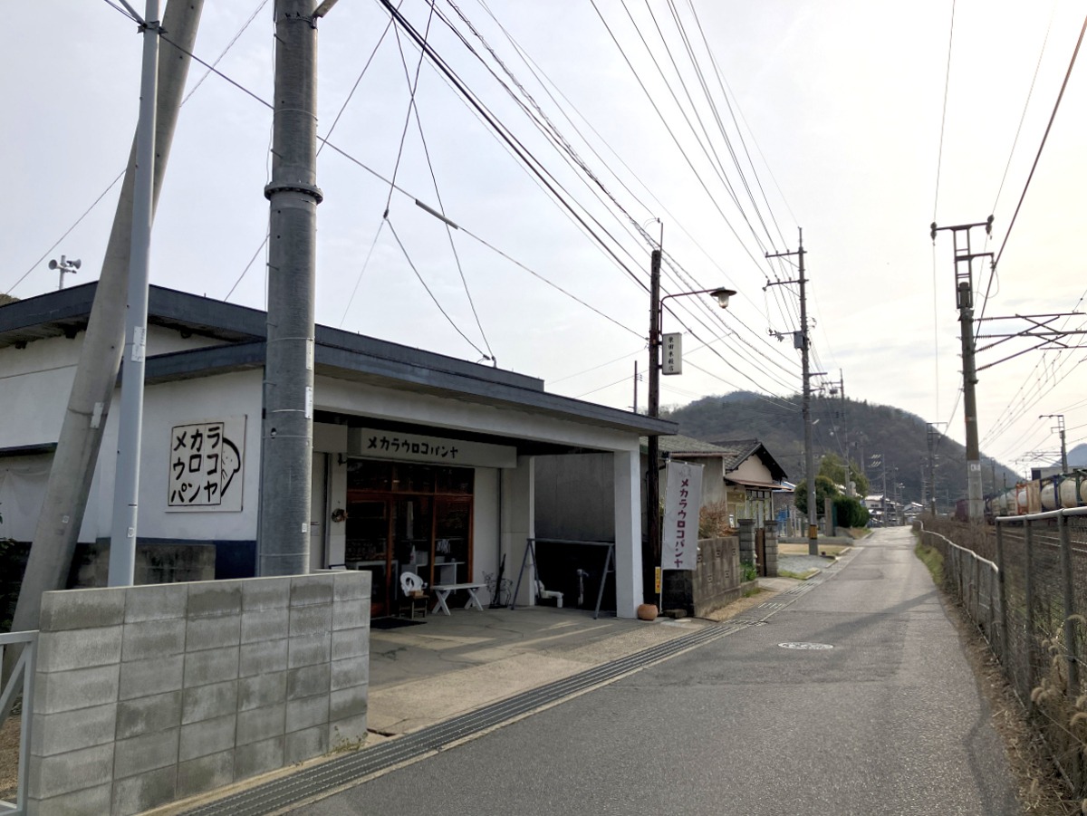 カタカナ多めの旗がたなびく線路脇。かわいい町のパン屋「メカラウロコパンヤ」さんです。小さなお店ですが調理パンなどまで種類が豊富。歩いた後のご褒美用に、がっつり炭水化物の「ベーコンとみたらし団子パン」を買ってみました。「どんな味なんだろか」と、あたまにハテナを浮かべながらも歩みは止めず。