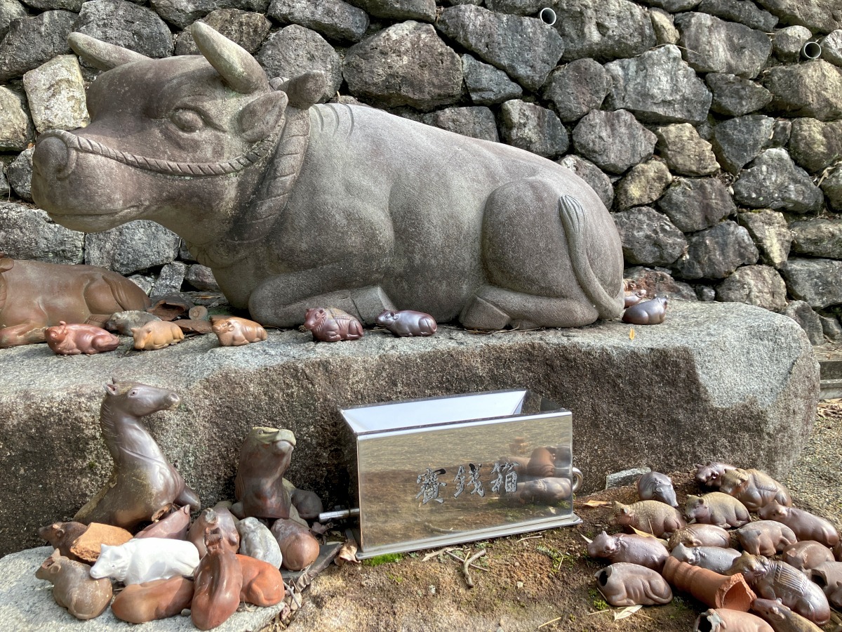 うねるような大木の門をくぐると、そこにはやさしいお顔の牛さんが。周りには小さな牛さんたちもずらりと座っています。さすが「田倉牛神社」で有名な吉永町。南方にもこんなかわいい牛神さまが祀られているんですね。階段の先にはさらに町が一望できる展望スペースも。教えてくださった地元の方に感謝です。