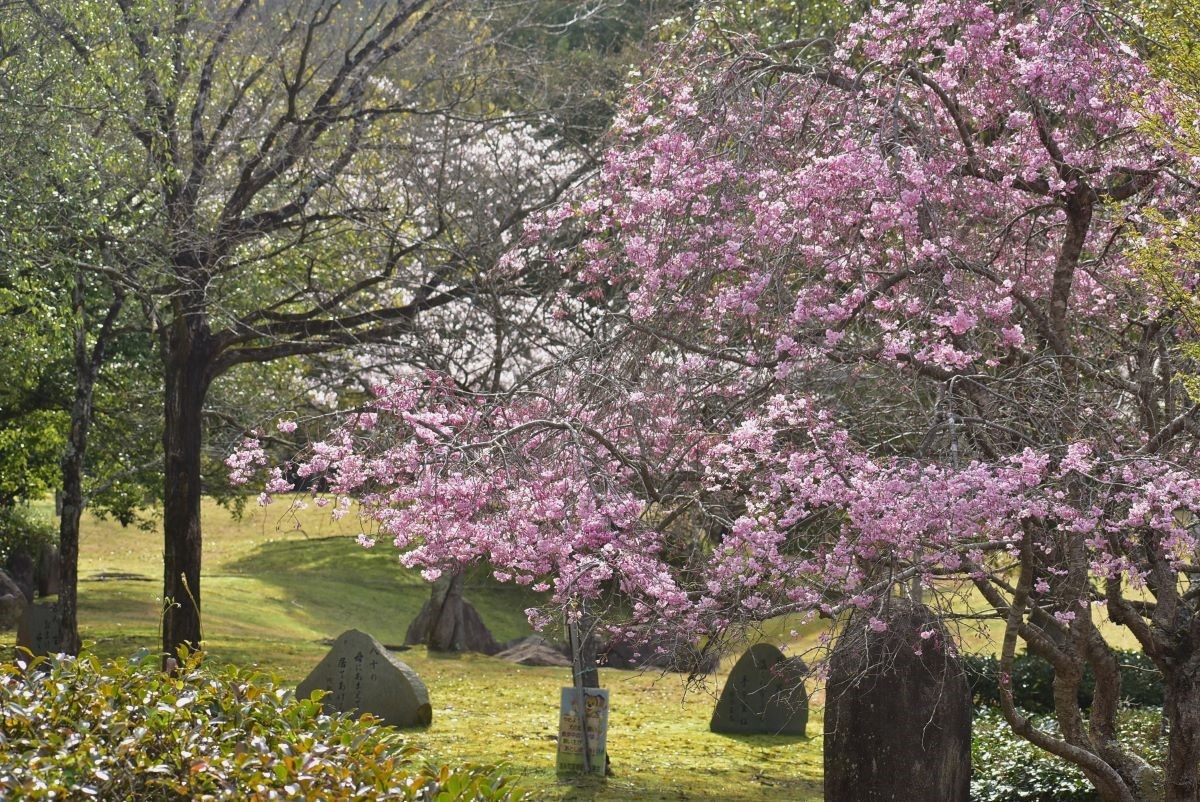 春に閑谷を訪れたなら。閑谷神社の東隣、石塀のむこうにのびる椿山を忘れてはなりません。約400本とも言われるヤブツバキ。枝々が幾重にも折り重なるトンネルの先の墳丘には、池田光政の髪や歯が埋められているんだとか。