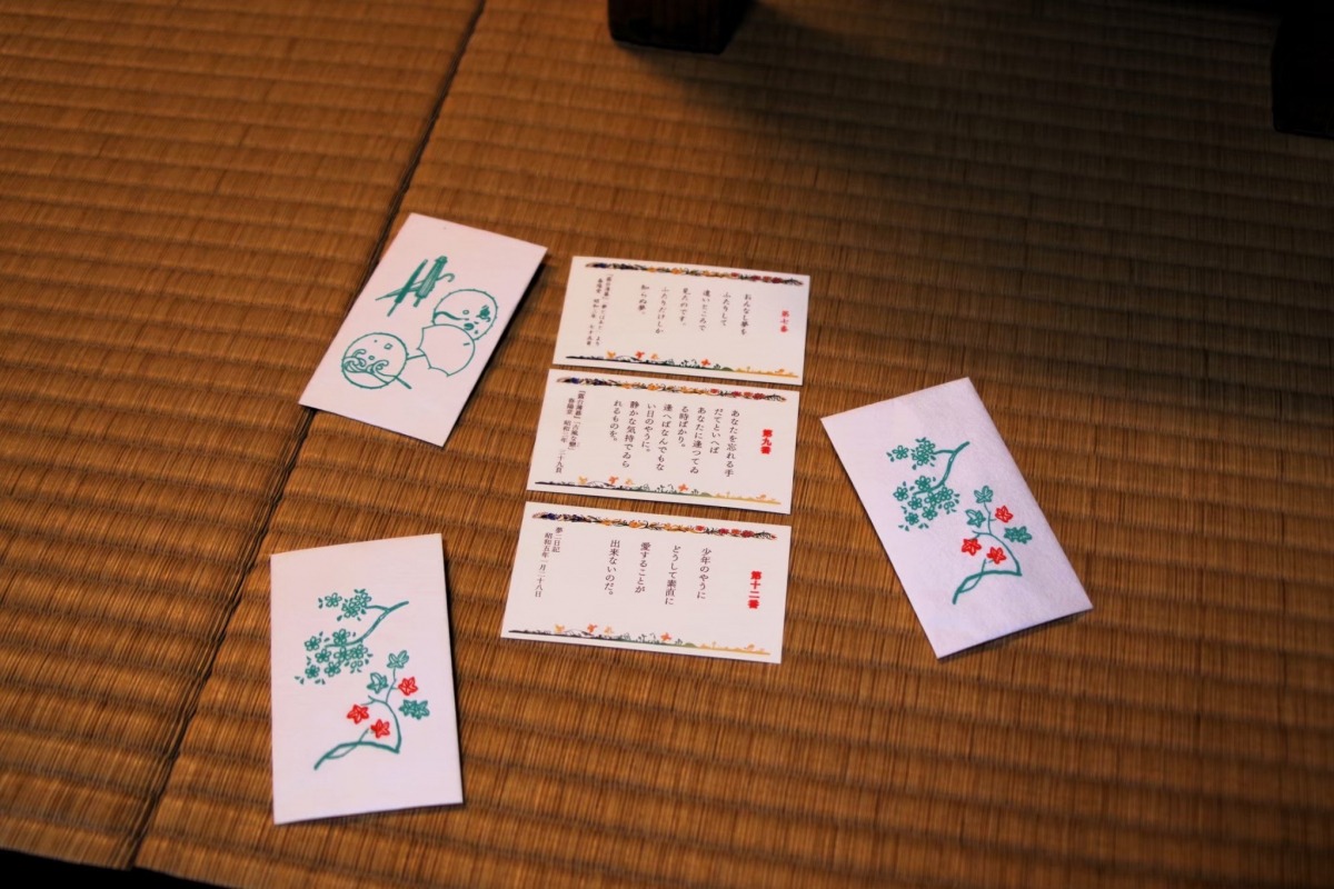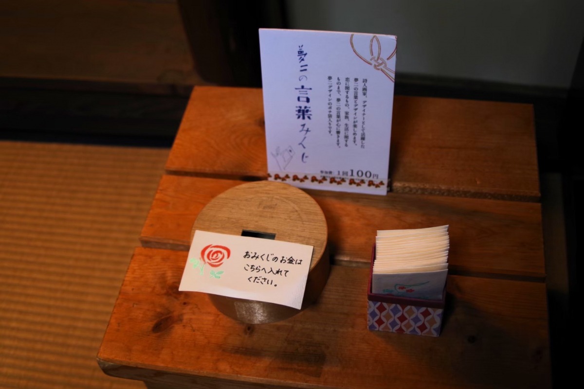 奥の間では、夢二にちなんだおみくじを引くことができます。おみくじの入ったポチ袋もデザインが複数あり、絵柄を選ぶ楽しさも。
