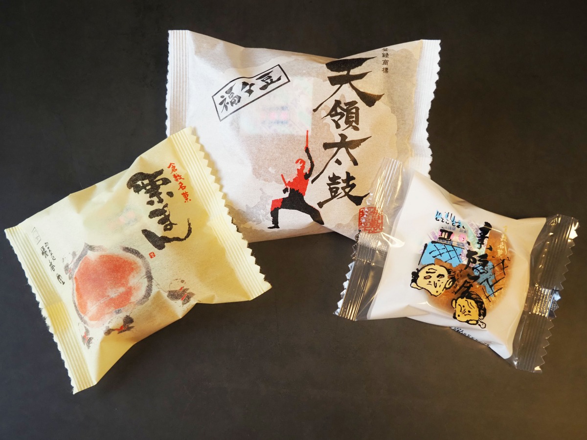 大きな栗をまるごとひとつ使い、しっとり焼き上げた「栗まん」、倉敷の郷土芸能である天領太鼓を表現したどら焼き「天領太鼓」、阿智神社のお祭りの際に現れる素隠居(すいんきょ)のご利益に願いを込めた最中「素隠居」など、お土産にすると話題に花が咲きそうなお菓子が多くあり、おすすめです。