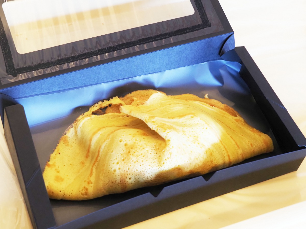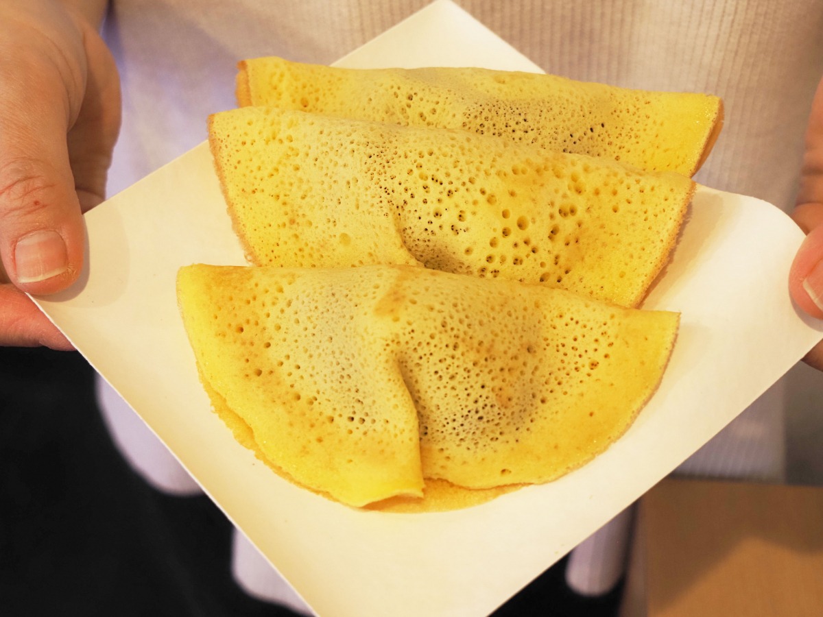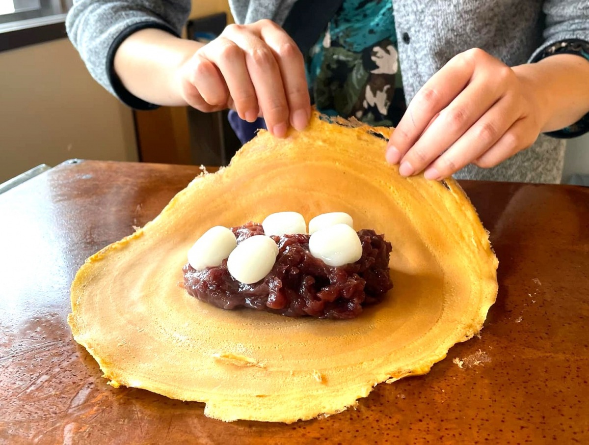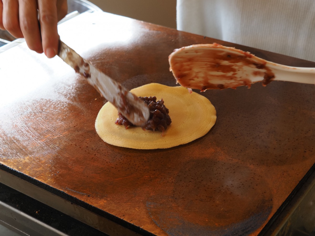 新鮮な卵を使用した生地を薄く焼き、そこに厳選された粒あんをのせて半月状に折りたたんだシンプルな一品。