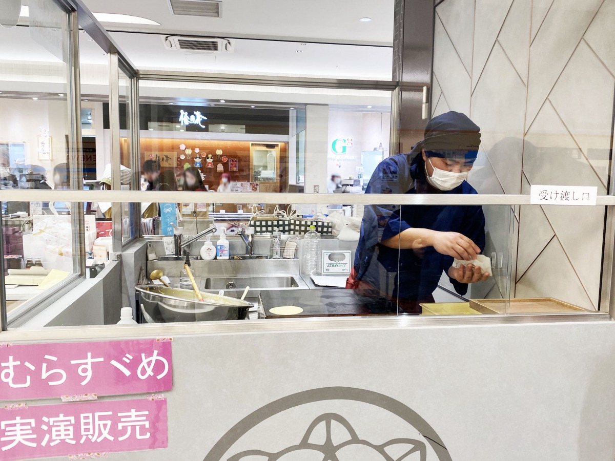 お土産の購入ができるのはもちろん、店舗内に実演ブースが設けられており、焼きたての「むらすゞめ」が購入できます。