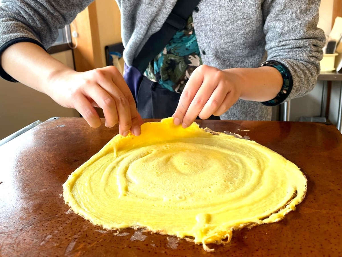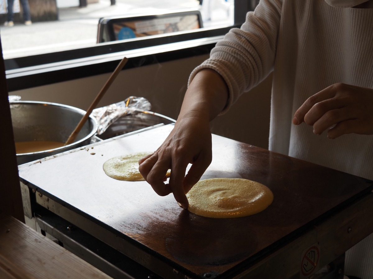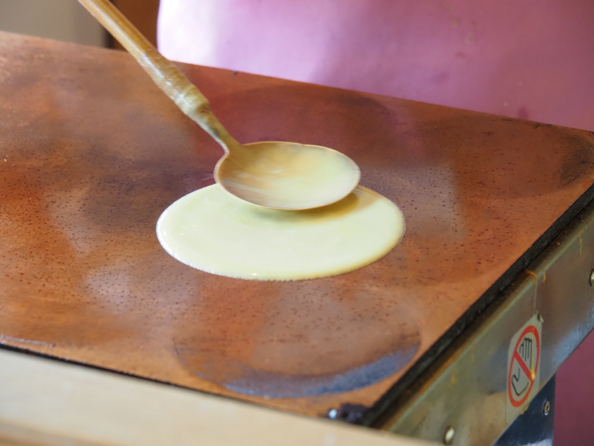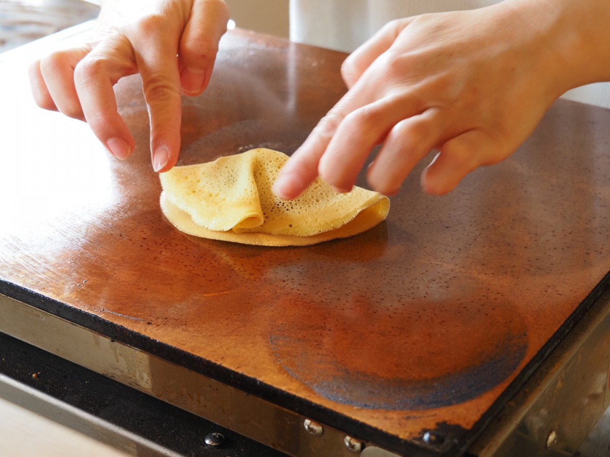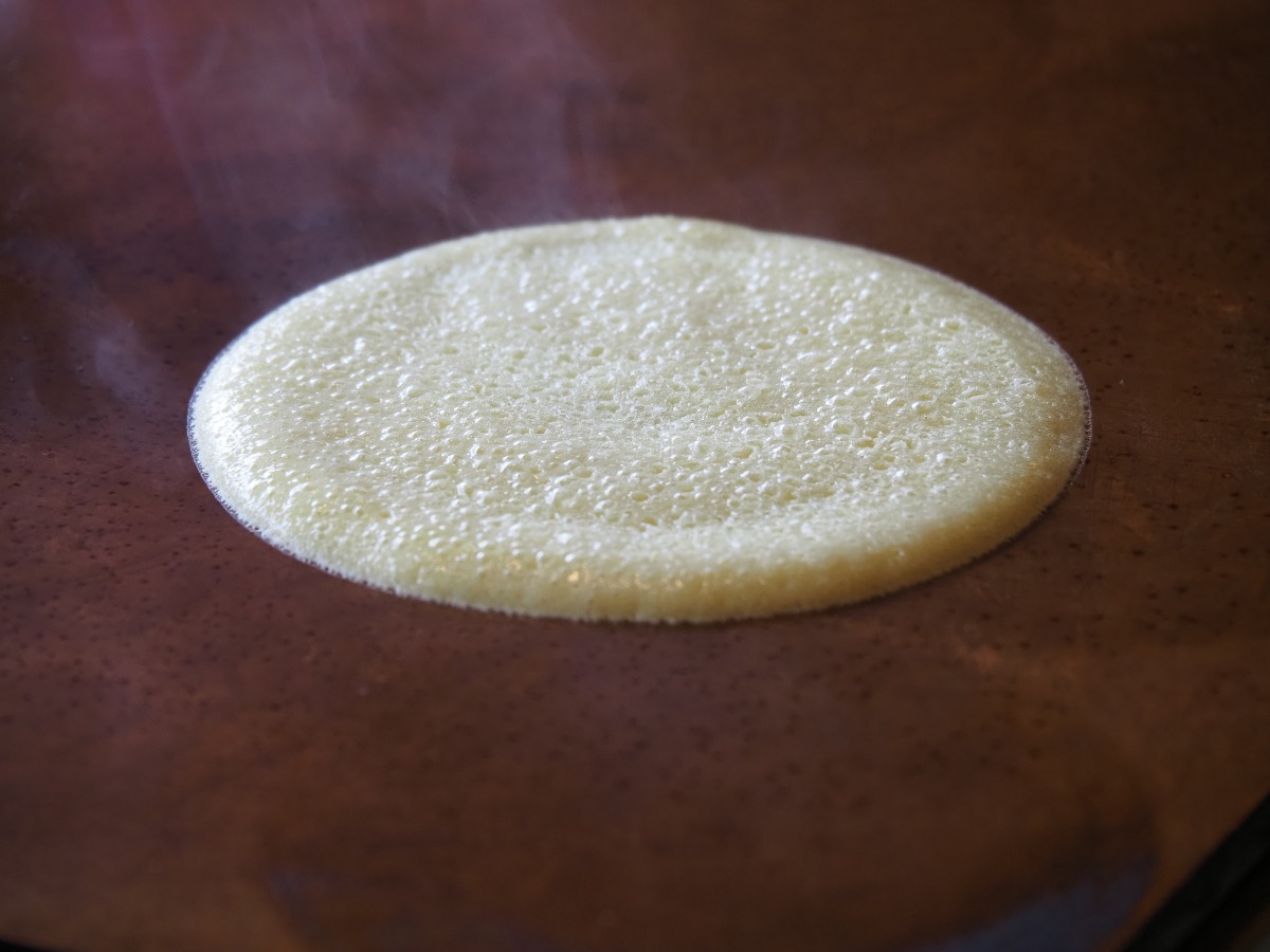 180度の鉄板に小さい厚めのクレープのように生地を広げ、プツプツと気泡が出てきたら、指でひっくり返すとのこと! 果たしてできるのか!?