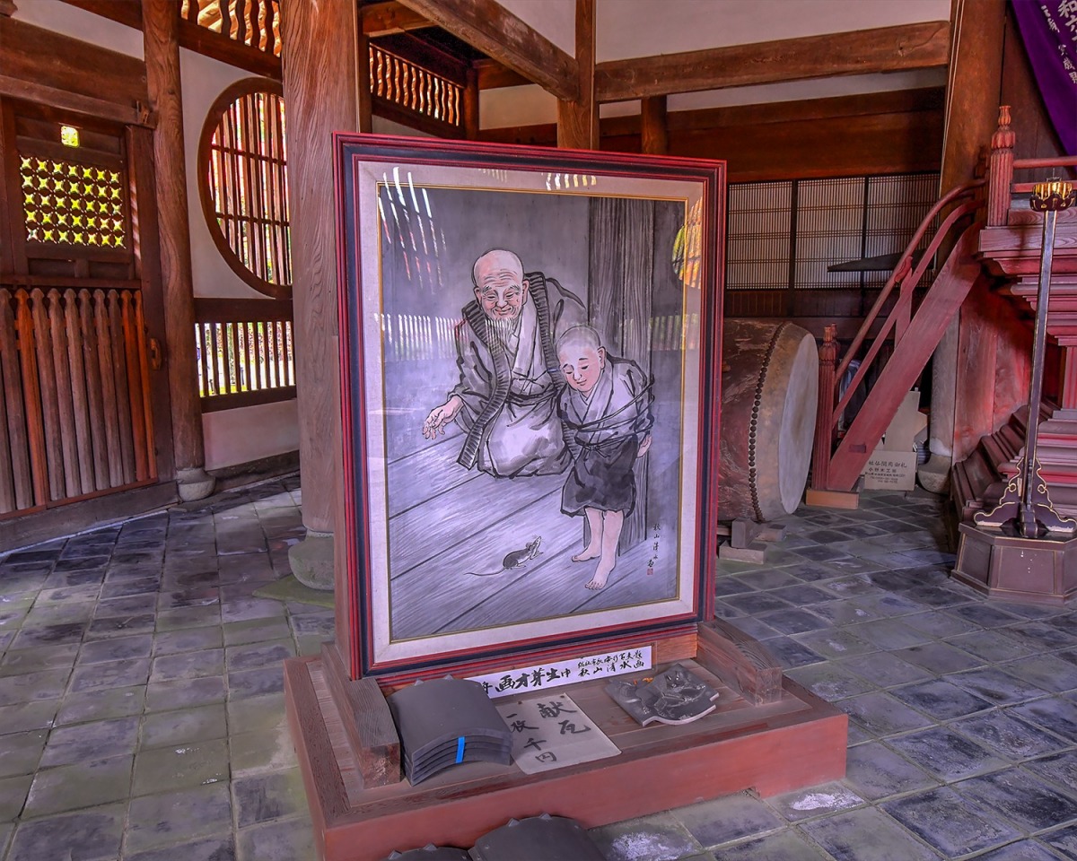 禅僧になるため、幼くしてこの寺に入った雪舟は、禅の修行はそっちのけで、好きな絵ばかり描いて日々を過ごしていました。それに腹を立てた住職は、ある朝、少年を本堂の柱に縛りつけてしまうのですが、少し可哀想に思い、夕方になって、本堂を覗いてみることにしました。すると、少年の足もとで一匹の大きな鼠が動き回っているではありませんか。少年が噛まれては大変と思い、住職はそれを追い払おうとしましたが、不思議なことに鼠はいっこうに動く気配がありません。それもそのはず、その鼠は生きた鼠ではなく、少年がこぼした涙を足の親指につけ、床に描いたものだったのです。はじめ動いたようにみえたのは、鼠の姿がまるで本物のように生き生きととらえられていたからにほかなりません。それ以後、住職は少年が絵を描くのをいましめることはけっしてありませんでした。